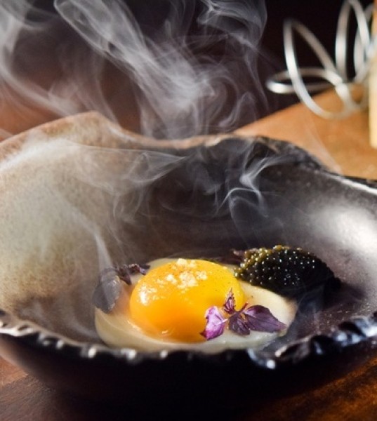 Catalunya’s contemporary take fools the eye. Chef Ferran Tadeo put together the Tramezzini Soldier Egg, which features a Japanese soft-cooked egg yolk surrounded by califlower gelatin and a dollop of caviar.