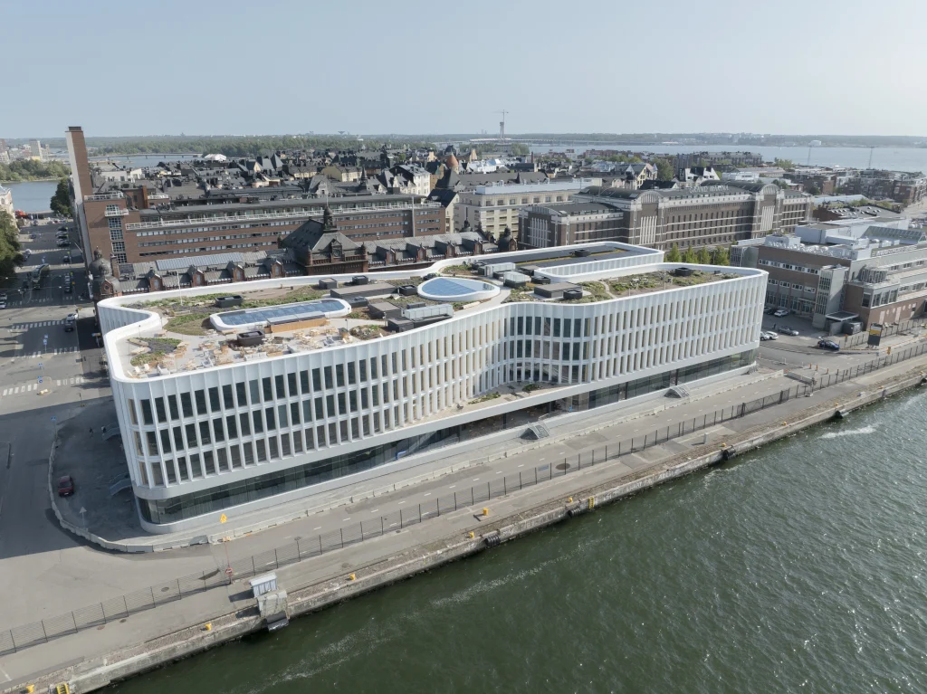 Finland’s commitment to carbon neutrality is driving innovation in sustainable building practices. Katajanokan Laituri, designed by Anttinen Oiva Architects, stands as a powerful symbol of this progress. The undulating solid wood structure, housing Solo Sokos Hotel Pier 4 and the headquarters of Finnish forestry and renewable solutions company Stora Enso, showcases the beauty and versatility of large-scale wooden architecture. The edifice’s circular lobby with soaring ceilings envelops visitors in a warm embrace, its organic materials fostering a sense of peacefulness and connection to Finland’s deep- rooted timber heritage. As guests move through the hotel’s hallways, the soothing sounds of birdsong create a serene, immersive experience, reinforcing the country’s innate bond with nature.