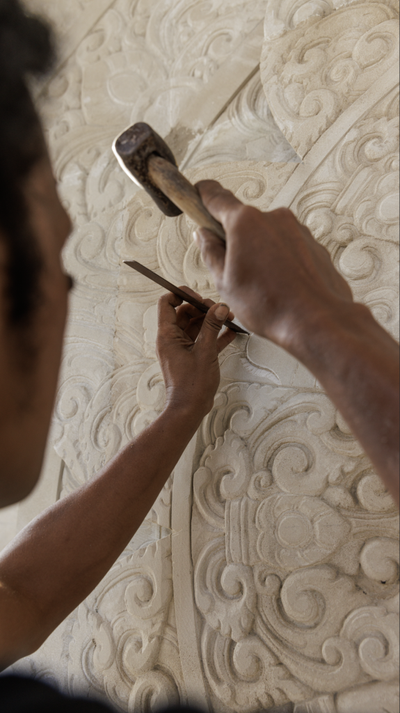 Newly opened this November, the Regent Bali Canggu marks a full-circle return for the brand. Conceived as a living, breathing tribute to Bali’s natural and cultural rhythm, the resort’s design is deeply symbolic, woven with layers of meaning that honour Balinese heritage in every form and finish. Perhaps the most striking is the monumental, five-tonne Javanese paras sandstone carving at the arrival pavilion. Handchiseled over 30 days by a handful of local artisans, the stonework speaks to the island’s enduring beauty and artistic legacy, featuring a sacred lotus (or padma in Sanskrit) motif that evokes the spiritual purity of the padmasana throne, offering both a visual and philosophical anchor throughout the resort.