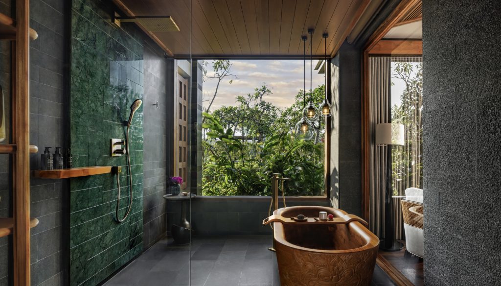 Architecturally, WATG has sensitively married Balinese hallmarks with clean, contemporary silhouettes while the interiors by Hirsch Bedner Associates draw from a palette grounded in nature – warm neutrals alongside wood and stone expressed in a variety of textures that subtly echo traditional batik, songket motifs and Balinese iconography – with occasional pops of colour like green Indian marble shower accent walls and golden throw pillows. All bespoke, the furniture feels comfortably residential yet refined. My favorite aspect of the design was the solid teakwood bathtub – a “personal haven” in Regent speak – carved intricately with the masked face of the mythical Barong creature. Regardless of room type, all 150 accommodations have one.