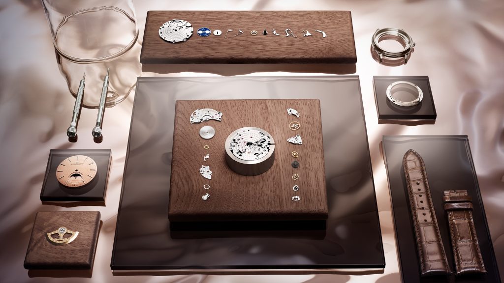 The calibers can be seen in full view through the transparent sapphire case-back. They feature fine decorative finishes including Côtes de Genève, bevelled bridges and blue screws. An open-worked 18- carat pink gold winding rotor adds to the aesthetic.