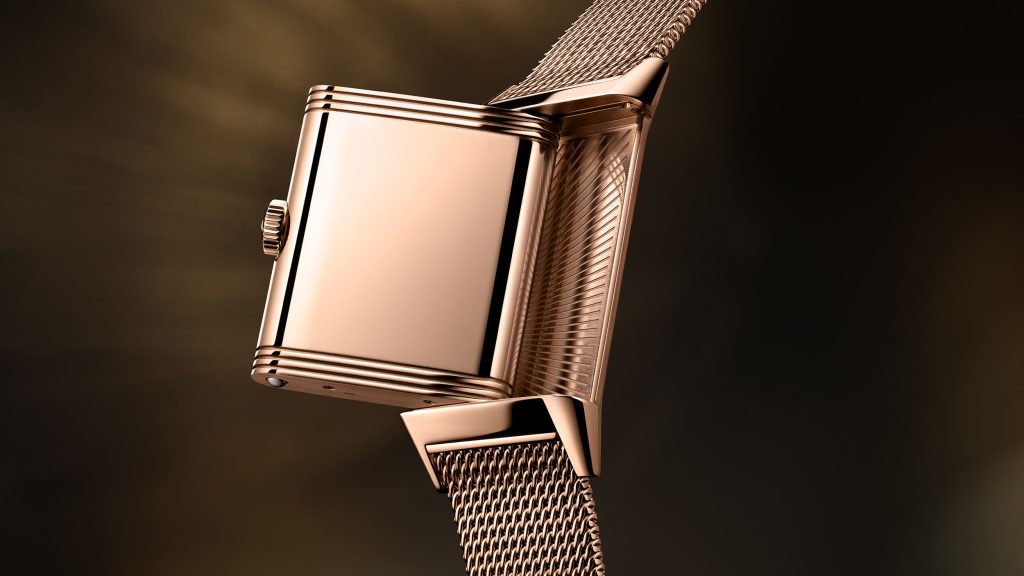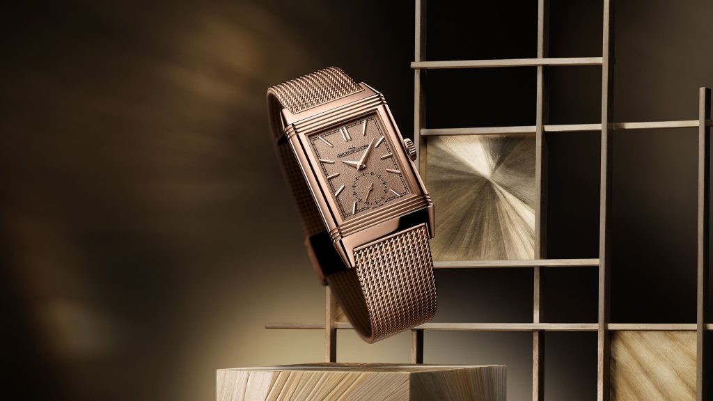 The final model is the Reverso that pushes style the furthest this year. Its Milanese mesh bracelet in rose gold drapes like fabric, falling naturally against the wrist and matching the slender lines of the Reverso case. The grained gold dial has a soft, matte texture, accompanied by elongated indices and a small seconds subdial, a quiet, vintage-leaning charm.