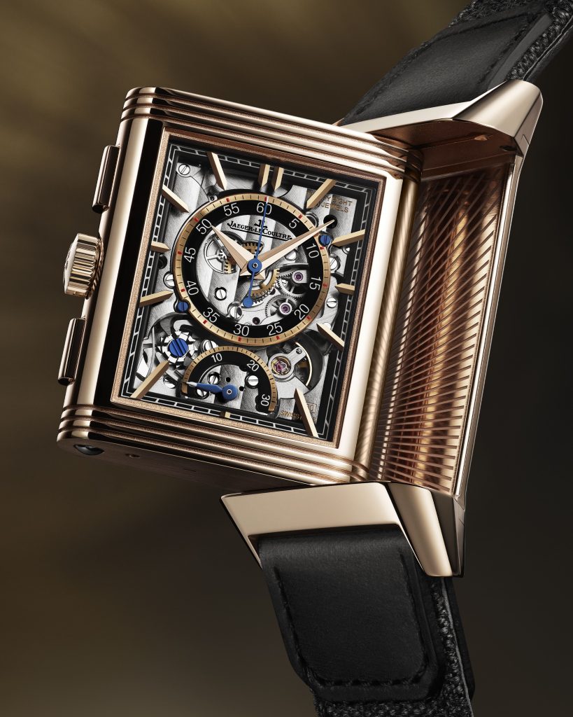 If the Reverso symbolises craftsmanship and style, its double-sided chronograph is one of the most compelling interpretations. The front keeps the Tribute series’ familiar language: baton markers, dauphine hands, sunray brushing. Turn it over and the skeletonised reverse reveals the full choreography of calibre 860, with retrograde minutes and chronograph seconds creating bold visual drama.