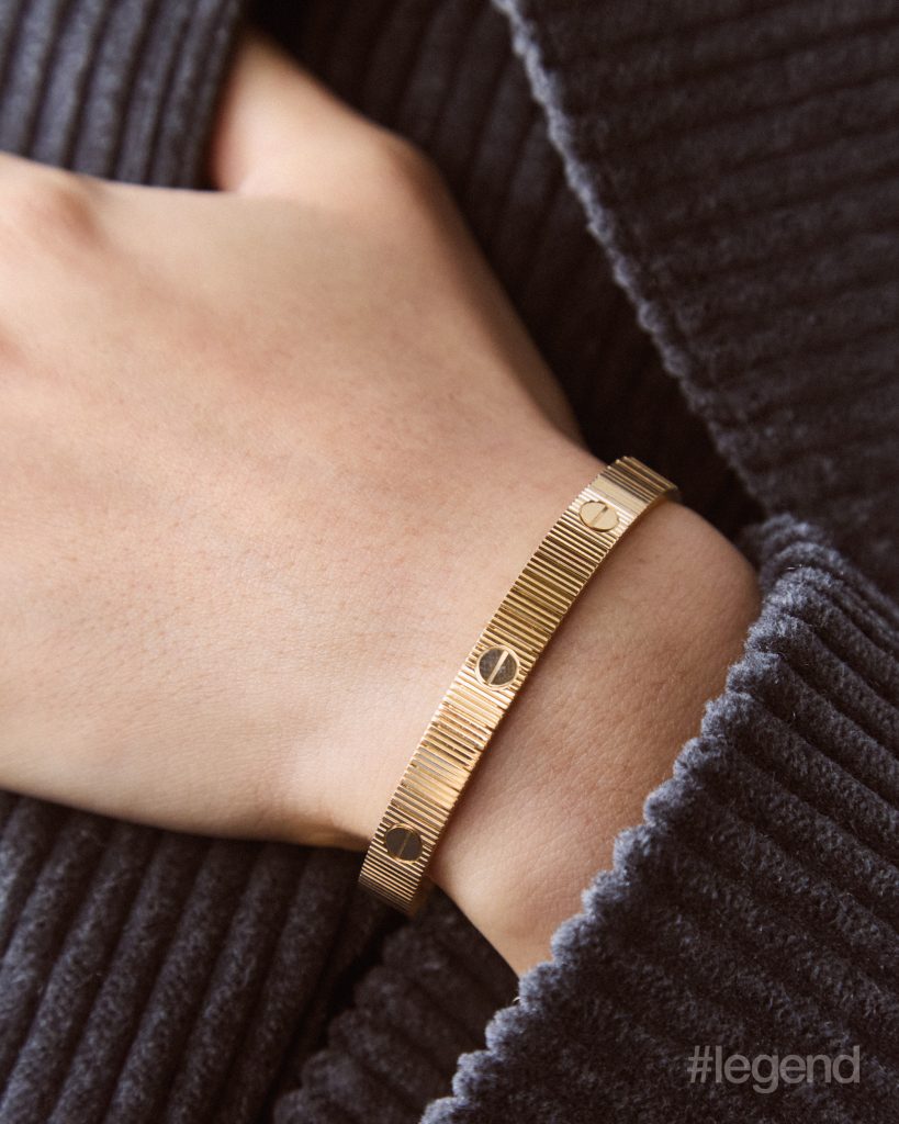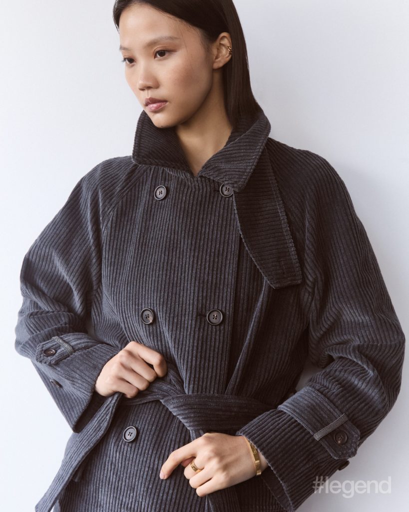 Love Unlimited bracelet in 18k yellow gold _ Cartier; Blue corduroy trench coat _ Brunello Cucinelli