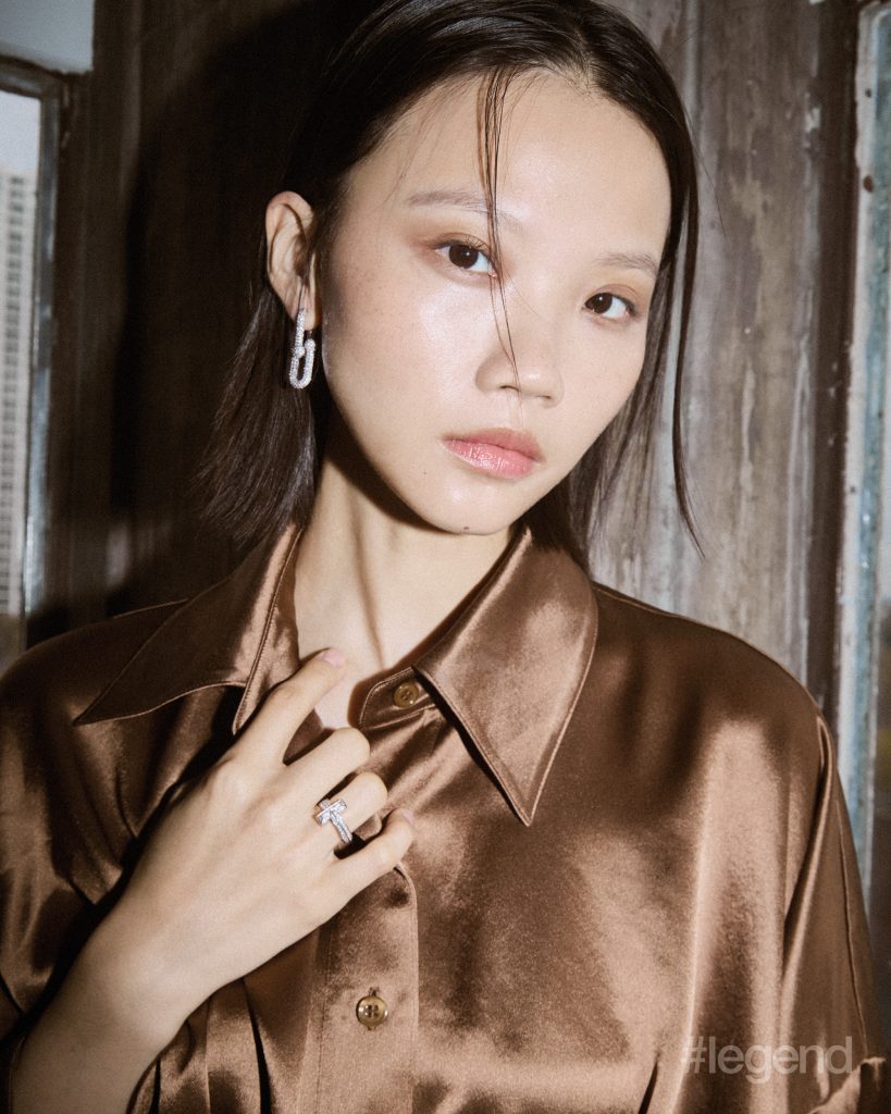 Tiffany HardWear Link earrings and Tiffany T1ring in 18k white gold with diamonds _ Tiffany & Co.; Brown silk shirt _ Mark Fast