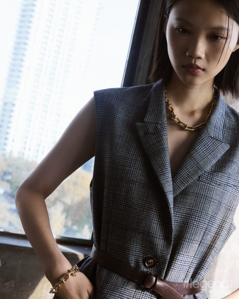 Tiffany HardWear Graduated Link necklace in 18k yellow gold and Tiffany HardWear Link Bracelet in 18k yellow gold with diamonds _ Tiffany & Co.; Grey plaid vest and brown leather belt _ Brunello Cucinelli