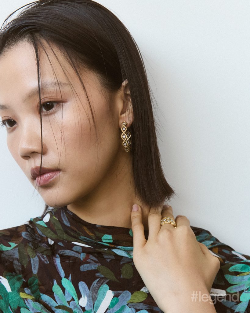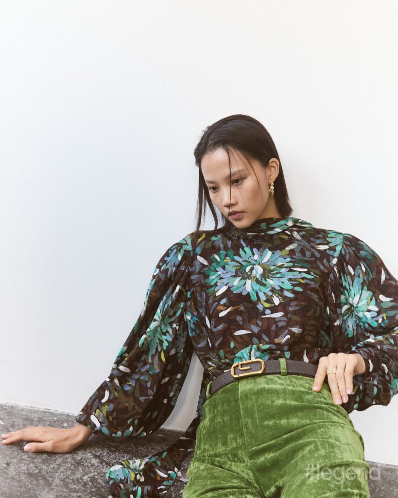Étoilée hoop earrings and ring in yellow and white gold with diamonds _ Buccellati; Floral print top, green velvet trousers and black leather belt _ Gucci