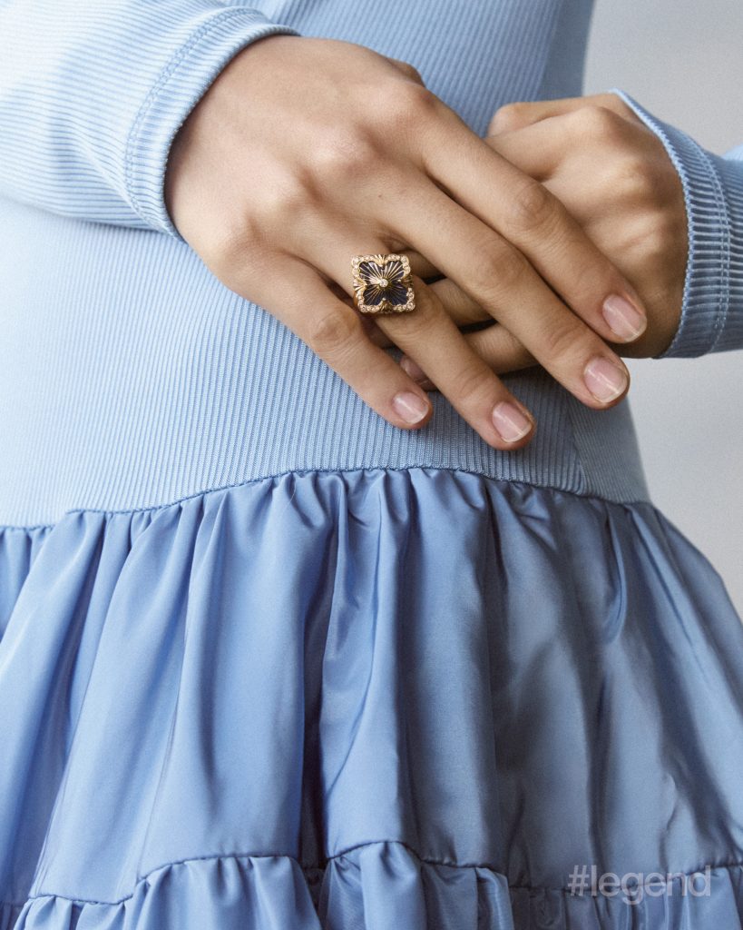 Opera Tulle ring in yellow gold with blue enamel and diamonds _ Buccellati; Blue long-sleeve dress _ Mark Fast