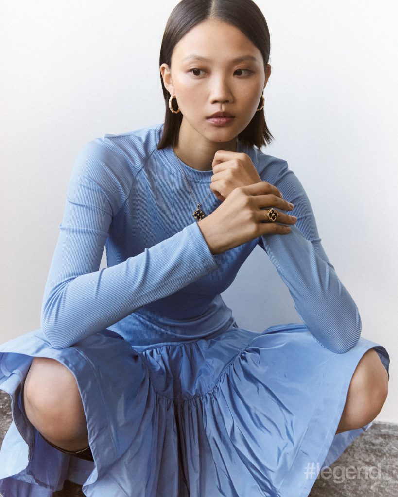 Macri hoop earrings in yellow gold with diamonds, and Opera Tulle pendant and ring in yellow gold with blue enamel and diamonds _ Buccellati; Blue long-sleeve dress _ Mark Fast