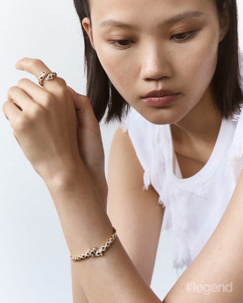 Panthère de Cartier bracelet and ring in 18k yellow gold with diamonds, onyx and emeralds _ Cartier (Stylist’s own dress)