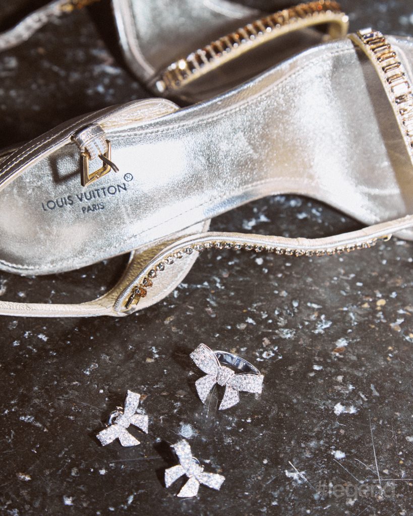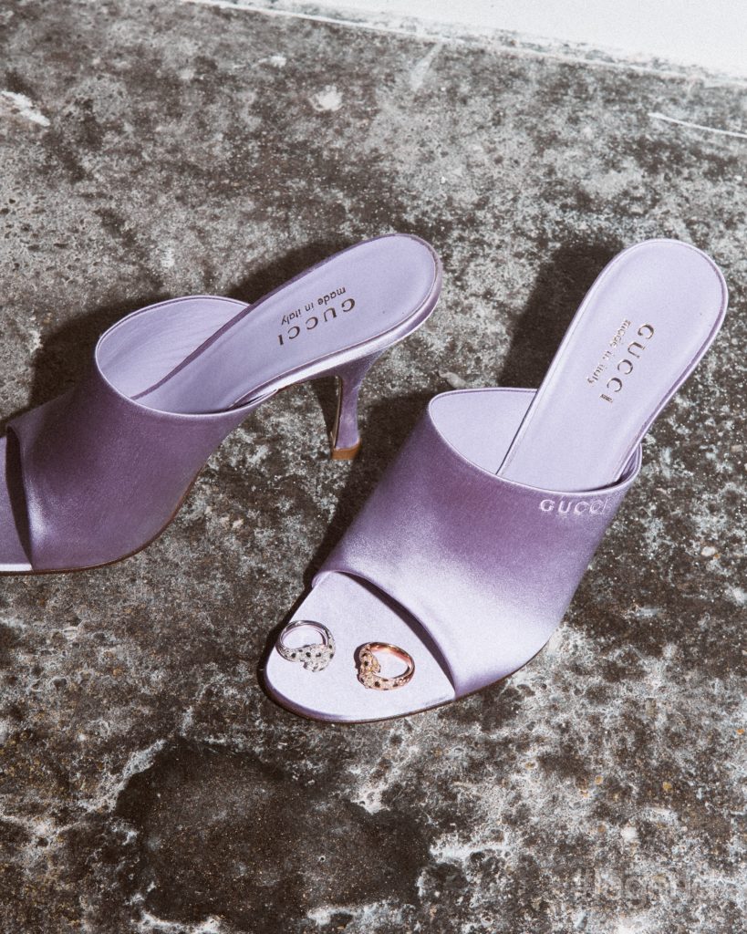 Panthère de Cartier rings in white and pink gold with with diamonds, onyx and emeralds _ Cartier; Purple satin heels _ Gucci