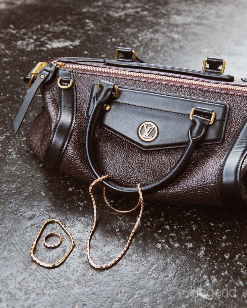 Le Damier de Louis Vuitton necklace in rose gold with diamonds, bracelet and ring in yellow gold with diamonds, and biker MM shoulder bag _ Louis Vuitton