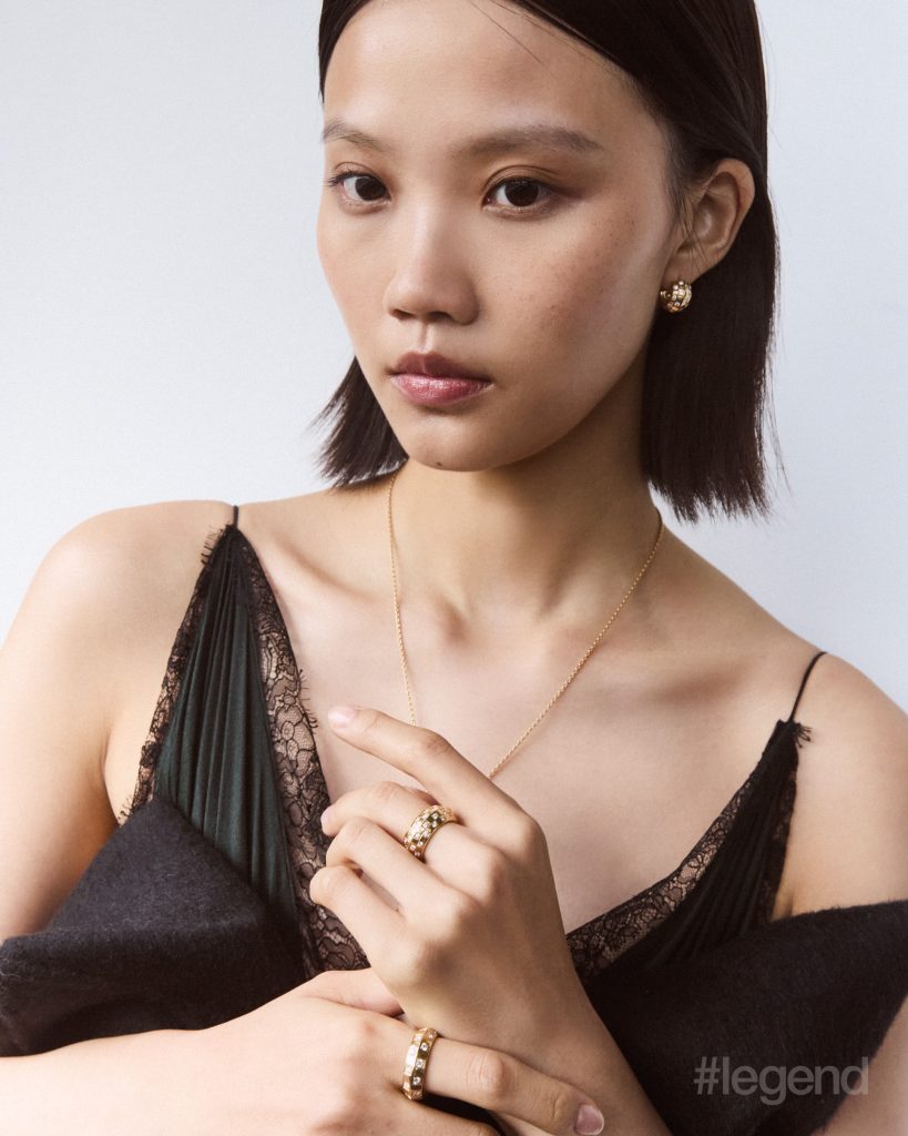 Le Damier de Louis Vuitton earrings, pendant and rings in yellow gold with diamonds, and black dress and bustier_ Louis Vuitton