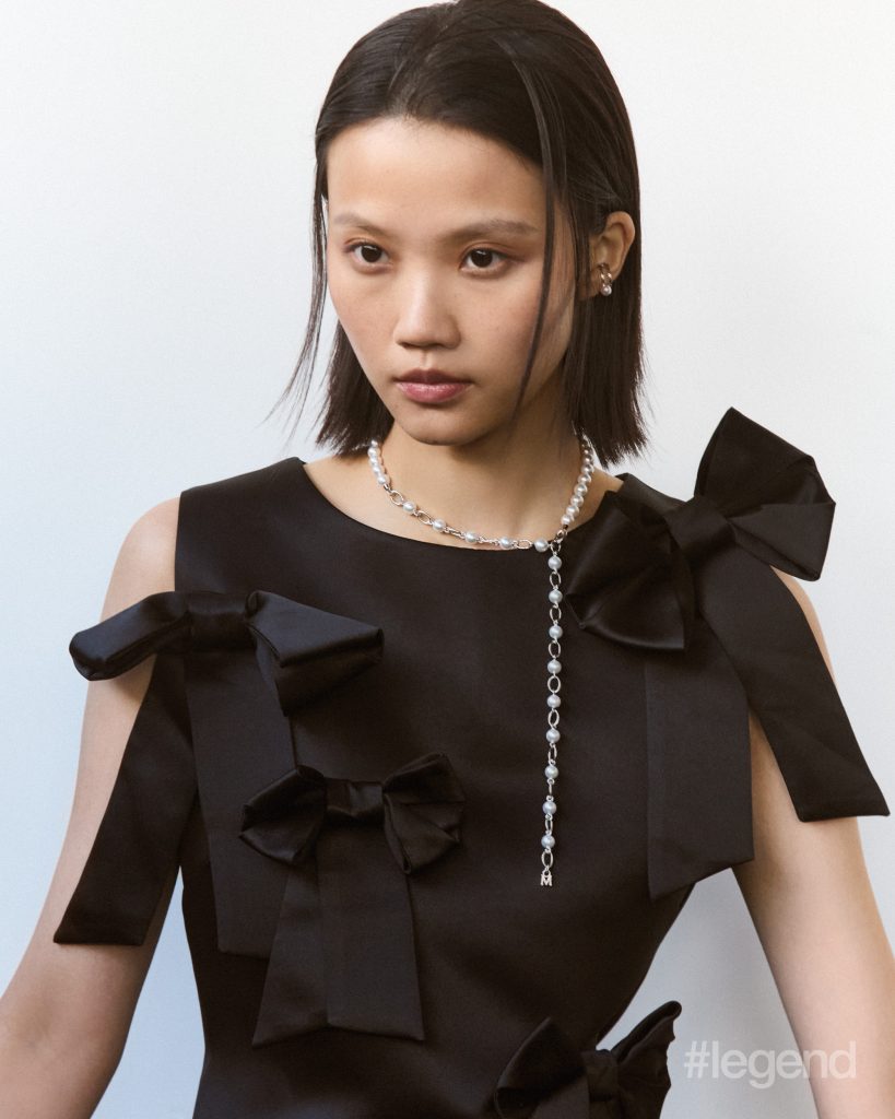 Ear cuff and M Code Liberté necklace in silver with Akoya cultured pearls _ Mikimoto; Black bow dress _ Ganni