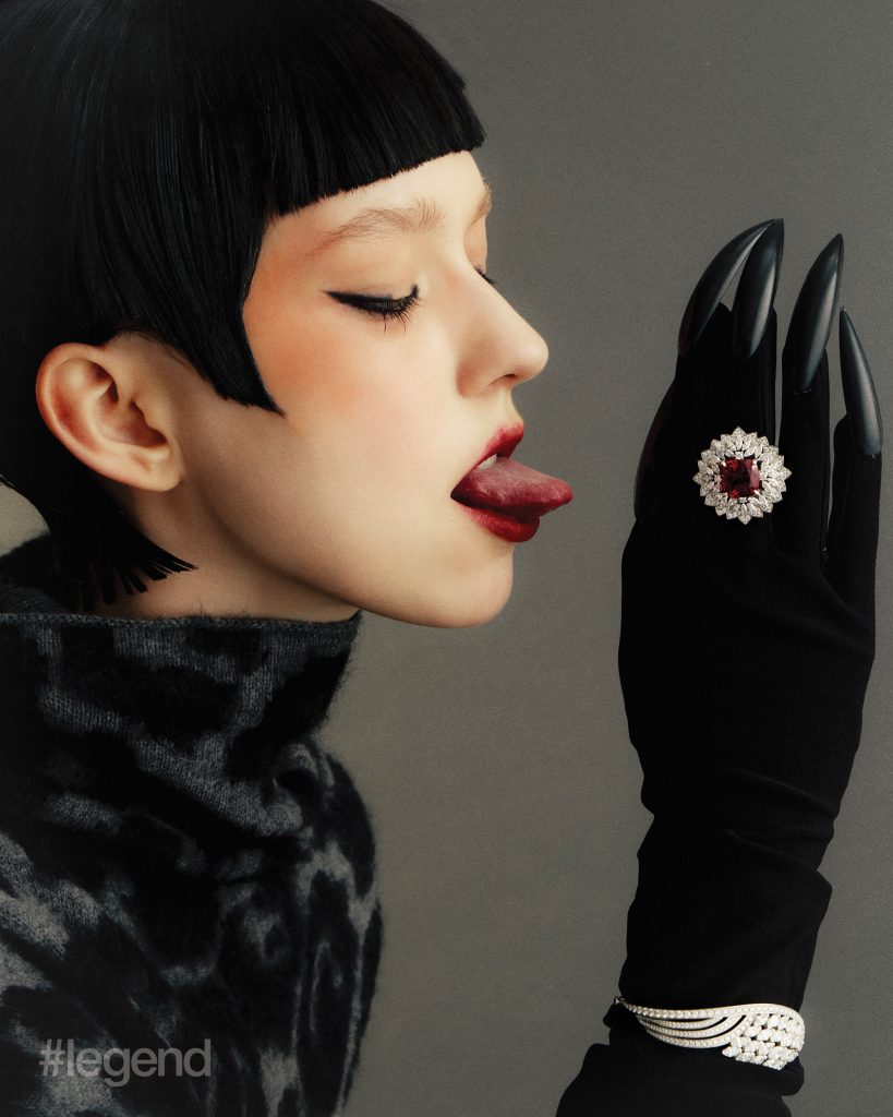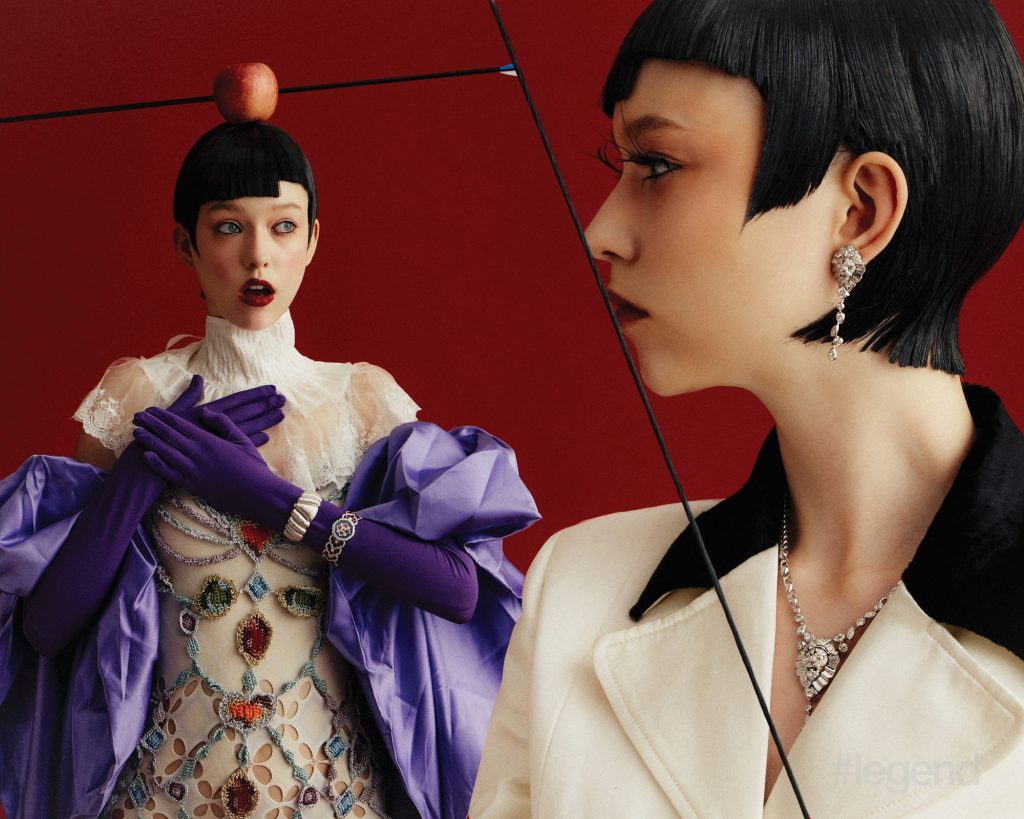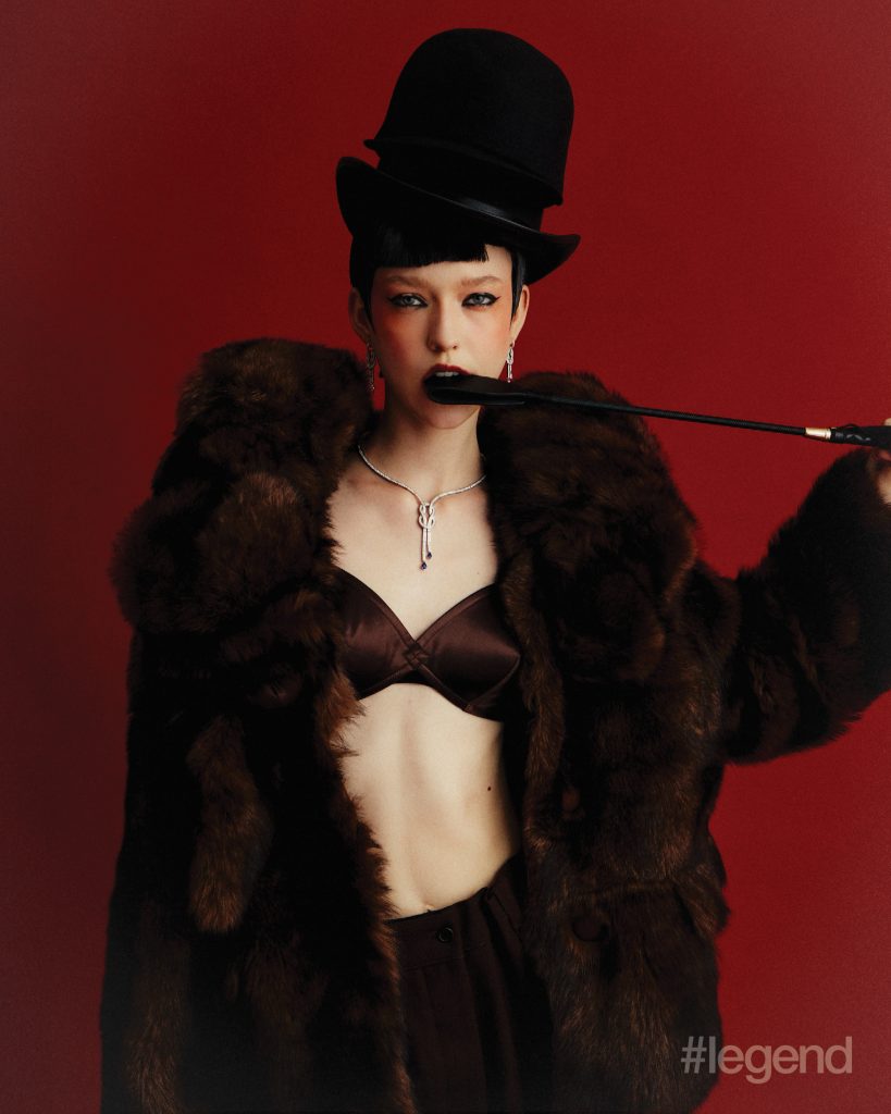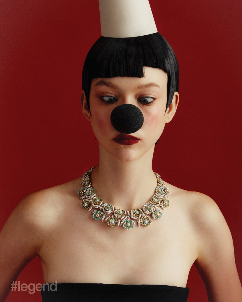 Tulle watch in white gold with red and blue enamel and diamonds, and High Jewellery bangle _ Buccellati; Multicolour and white open-work knit dresses _ Nan Knits; (Stylist’s own gown and collar); Lion Solaire de Chanel earrings and necklace in 18k white gold and diamonds, and white coat _ ChanelTilda’s Bow necklace in 18k yellow gold with pavé and baguette-cut diamonds _ Graff White shirt _ Dior Aqua midi skirt _ Prada (Stylist’s own corset and skirt)Quatre Classique short necklace _ Boucheron Blue open-back dress and leather pumps _ Balenciaga (Stylist’s own tights)Talisman Collection High Jewellery medallion pendant necklaces in 18k white gold and 18k yellow gold with diamonds, bangles in 18k yellow and white gold, and rings in yellow gold _ De Beers; Black asymmetric cape dress _ Stella McCartneyHigh Jewellery necklace _ Buccellati Black strapless jumpsuit _ Max MaraWings of Light bangle in 18k white gold and diamonds; and ring in 18k white gold, red spinel and diamonds _ Piaget Grey leopard print turtleneck jumper _ Stella McCartney; (Stylist’s own gloves)High Jewellery Collection necklace in white gold with opal and diamonds, and earrings in white gold with tourmalines _ Chopard; Green knit dress _ Nan Knits; Flower-embellished slingbacks _ Ferragamo (Stylist’s own bolero coat and hairpiece)Chance Infinie necklace in white gold with diamonds, and earrings in white gold with diamonds _ Fred; Dark brown fur jacket and shorts _ Prada Brown satin bra _ Miu Miu; Black felt hat _ Loro Piana (Stylist’s own hat)Panthère de Cartier necklace, bracelet and ring in white gold with diamonds, onyx and emeralds _ Cartier Shearling bolero coat _ Ferragamo Brown satin bra, silk top and skirt _ Miu Miu Belt bag _ Louis Vuitton Orange pumps _ Prada Brown felt hat _ Loro Piana (Stylist’s own boots, tights and gloves)Lux ring in white gold with angel skin coral cabochon, aquamarines, orange topazes, diamonds and turquoise _ Chaumet; Orange plaid leather top _ Maggie WangVibrations d’étoile necklace in 18k rose and white gold with three cushion-cut pink tourmalines, turquoise, onyx and diamonds _ Van Cleef & Arpels; Black strapless jumpsuit _ Max Mara