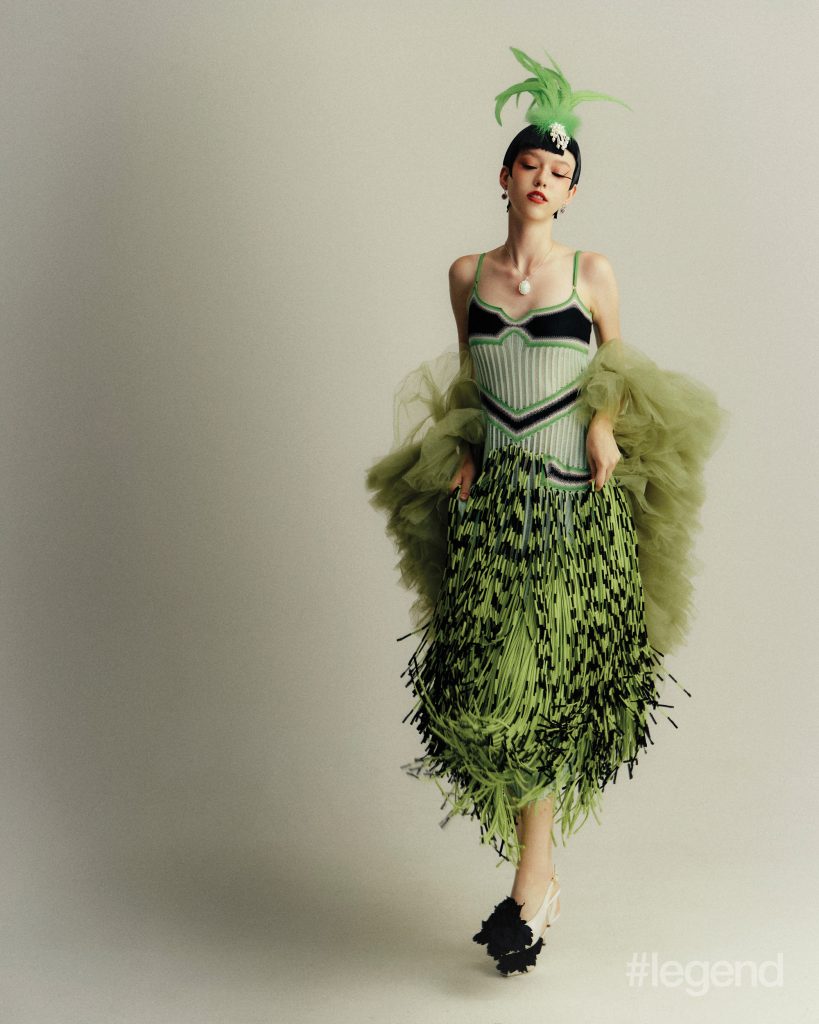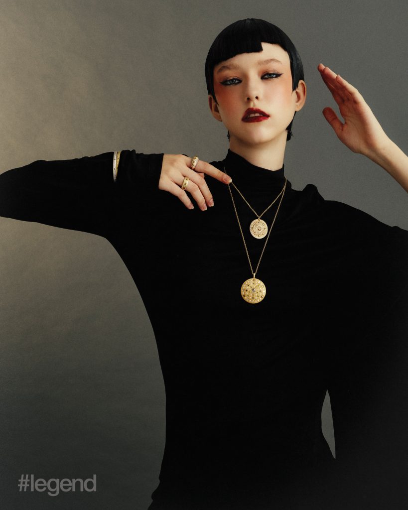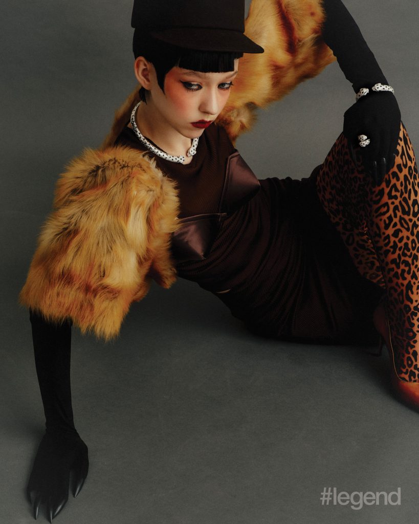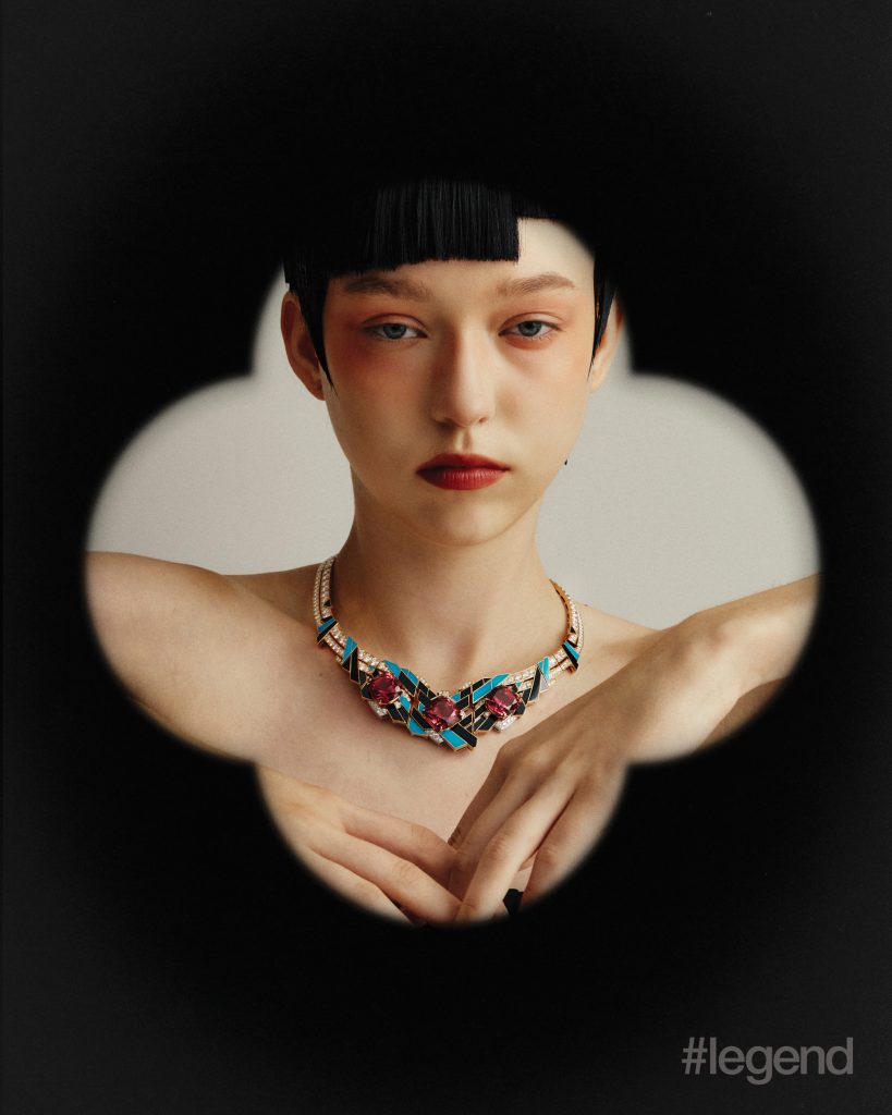 Tulle watch in white gold with red and blue enamel and diamonds, and High Jewellery bangle _ Buccellati; Multicolour and white open-work knit dresses _ Nan Knits; (Stylist’s own gown and collar); Lion Solaire de Chanel earrings and necklace in 18k white gold and diamonds, and white coat _ ChanelTilda’s Bow necklace in 18k yellow gold with pavé and baguette-cut diamonds _ Graff White shirt _ Dior Aqua midi skirt _ Prada (Stylist’s own corset and skirt)Quatre Classique short necklace _ Boucheron Blue open-back dress and leather pumps _ Balenciaga (Stylist’s own tights)Talisman Collection High Jewellery medallion pendant necklaces in 18k white gold and 18k yellow gold with diamonds, bangles in 18k yellow and white gold, and rings in yellow gold _ De Beers; Black asymmetric cape dress _ Stella McCartneyHigh Jewellery necklace _ Buccellati Black strapless jumpsuit _ Max MaraWings of Light bangle in 18k white gold and diamonds; and ring in 18k white gold, red spinel and diamonds _ Piaget Grey leopard print turtleneck jumper _ Stella McCartney; (Stylist’s own gloves)High Jewellery Collection necklace in white gold with opal and diamonds, and earrings in white gold with tourmalines _ Chopard; Green knit dress _ Nan Knits; Flower-embellished slingbacks _ Ferragamo (Stylist’s own bolero coat and hairpiece)Chance Infinie necklace in white gold with diamonds, and earrings in white gold with diamonds _ Fred; Dark brown fur jacket and shorts _ Prada Brown satin bra _ Miu Miu; Black felt hat _ Loro Piana (Stylist’s own hat)Panthère de Cartier necklace, bracelet and ring in white gold with diamonds, onyx and emeralds _ Cartier Shearling bolero coat _ Ferragamo Brown satin bra, silk top and skirt _ Miu Miu Belt bag _ Louis Vuitton Orange pumps _ Prada Brown felt hat _ Loro Piana (Stylist’s own boots, tights and gloves)Lux ring in white gold with angel skin coral cabochon, aquamarines, orange topazes, diamonds and turquoise _ Chaumet; Orange plaid leather top _ Maggie WangVibrations d’étoile necklace in 18k rose and white gold with three cushion-cut pink tourmalines, turquoise, onyx and diamonds _ Van Cleef & Arpels; Black strapless jumpsuit _ Max Mara
