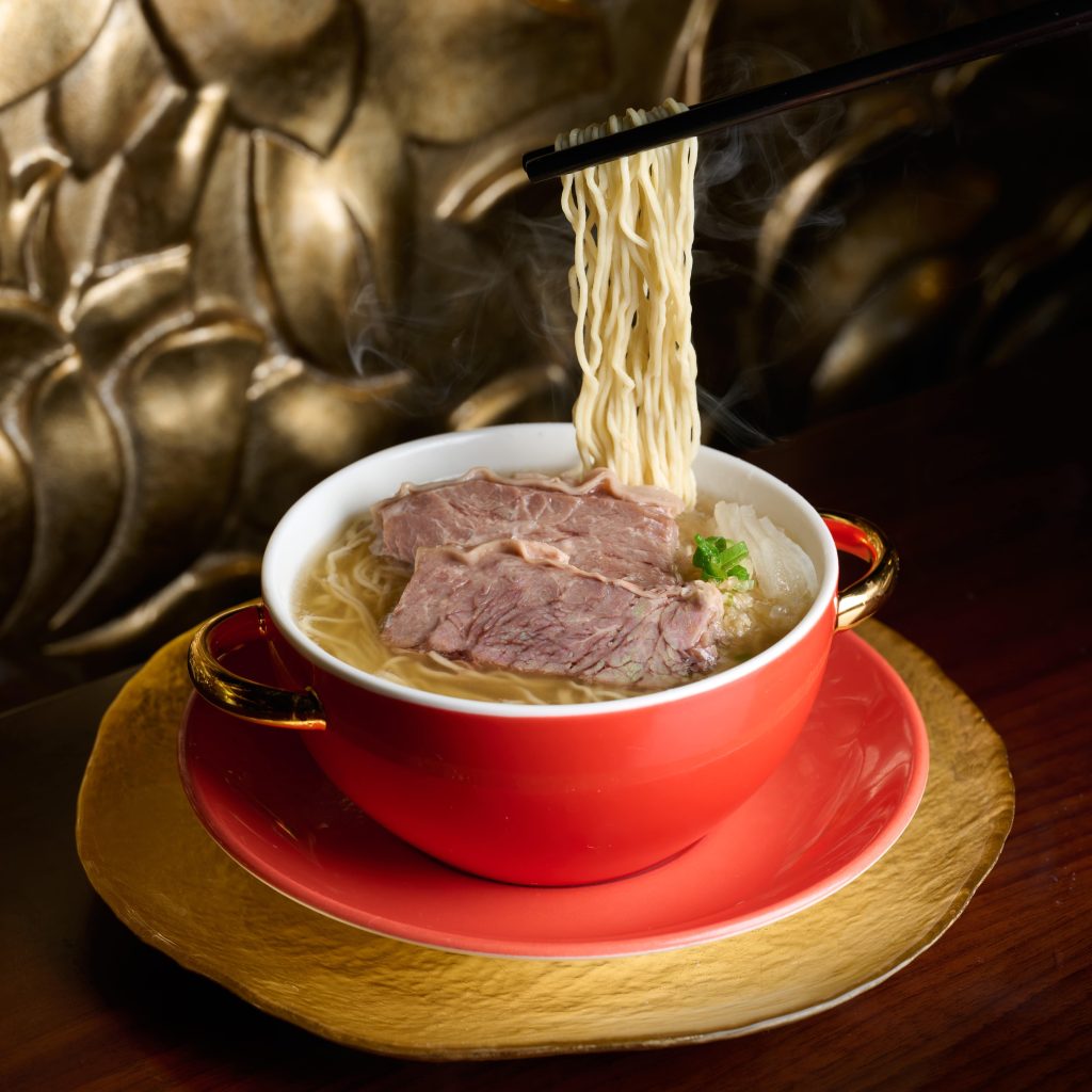 To close, Chef Leung presents two quintessential Cantonese comfort dishes with a refined twist. The seafood puffed rice arrives with a dramatic sizzle as the broth hits crisped grains, releasing an aromatic cloud that recalls the comfort of home. Meanwhile, the slow-braised beef noodles, tender and deeply flavoured, ground the menu with a reminder that innovation should always coexist with familiarity.