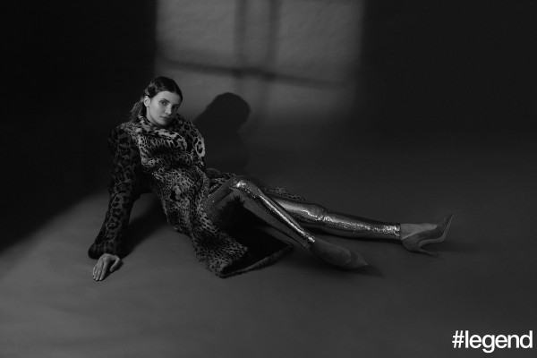 Black suit_Dior Homme; Rhinestone collar_Miu Miu; White pumps with plume_Jimmy Choo