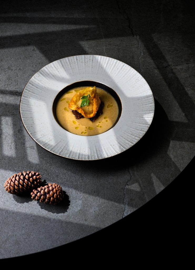 The journey begins with three intricate bocaditos – hamachi with long pepper and white kombu; pumpkin and ebi brightened with blood orange; and beef tartare with dashi gel – before moving into Andō’s signature Black Olive Sourdough and a luxuriant Ajo Blanco layered with Kristal caviar, Spanish Balfegó tuna, ao-nori and takana. Guests may enhance the experience with an optional Carabinero Red Prawns course, followed by Hokkaido Hand-Dived Scallop with truffle and parsnip, Kinki Fish with a maitake dumpling, and tender Pigeon paired with red cabbage and blueberry. The meal culminates in a comforting Arroz Caldoso of lobster, turmeric, kaffir lime leaves and Hong Kong–grown Yi O rice, before concluding with a sweet potato–chestnut Mont Blanc and delicate mignardises.