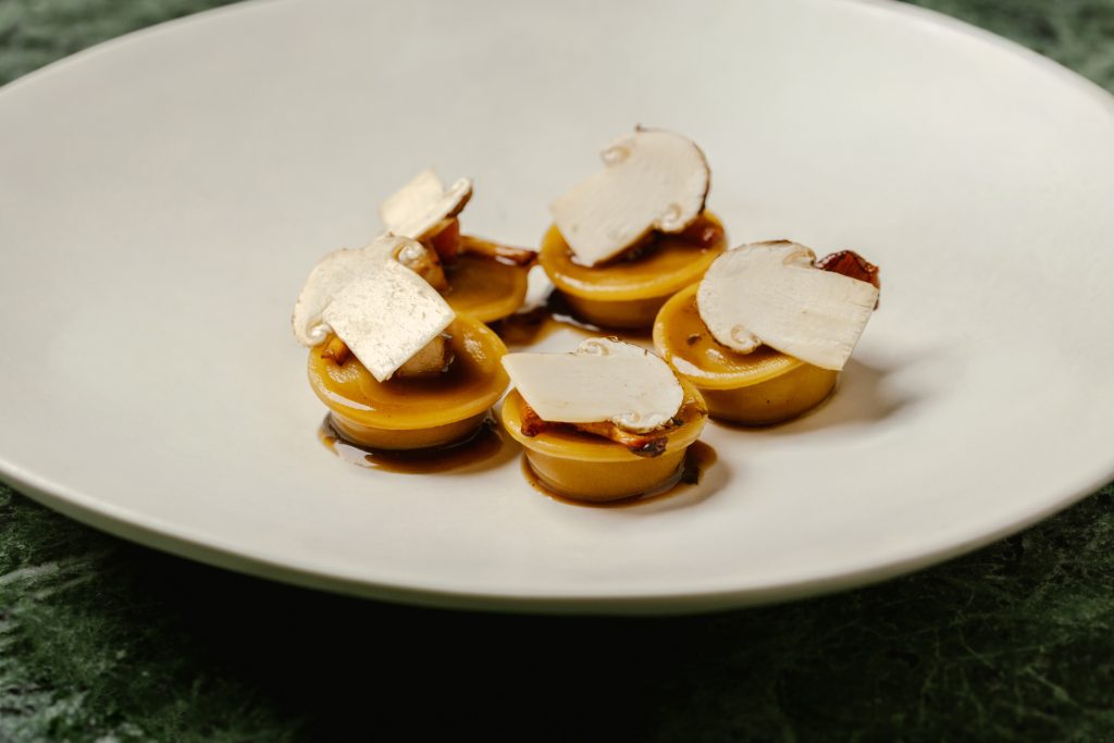 The experience begins with an aperitivo followed by Aori-ika with almond and caviar, leading into a vibrant Blue Lobster with fennel, dill and blood orange. A luxurious Linguine with Mazara red prawn and chilli precedes a delicate wild mushroom Consommé with tortellini. Guests may then choose between Bottoni with saffron and Melanosporum black truffle or Tagliolini in aromatic chicken–mushroom jus crowned with Alba white truffle. The main course offers a choice of Lamb with artichoke and mint or indulgent Wagyu M9 with morel and Melanosporum black truffle. The meal concludes on a festive note with Chestnut & Pear, with the option to enrich the dessert further with Alba white truffle.