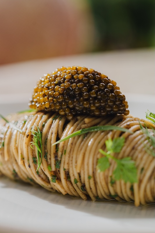 Next, there’s the Spicy Sausage Sando layered with Saint-Nectaire cheese and Louise’s homemade sausage made with pork shoulder, loin and belly; rich and elegant soft-boiled Japanese Oita Egg served with vin jaune espuma, crispy bacon, garlic croutons, confit onions with perigeux sauce and black truffle; and Homemade Cavatelli with Sicilian red prawn tartare and lobster bisque.