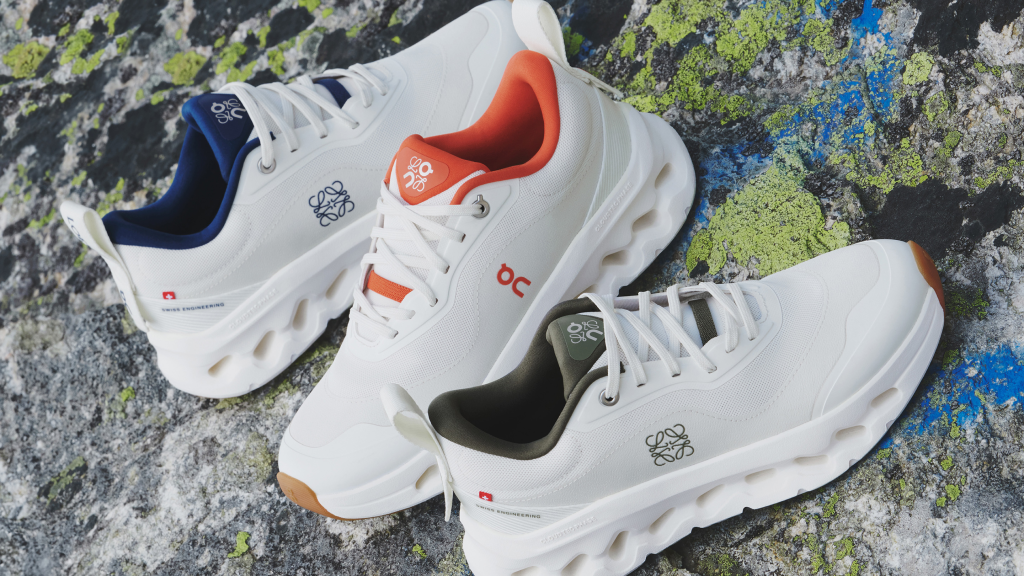 The logos of Loewe and On appear prominently on the sneaker, including a joint logo on the tongue that merges both brands’ identities.