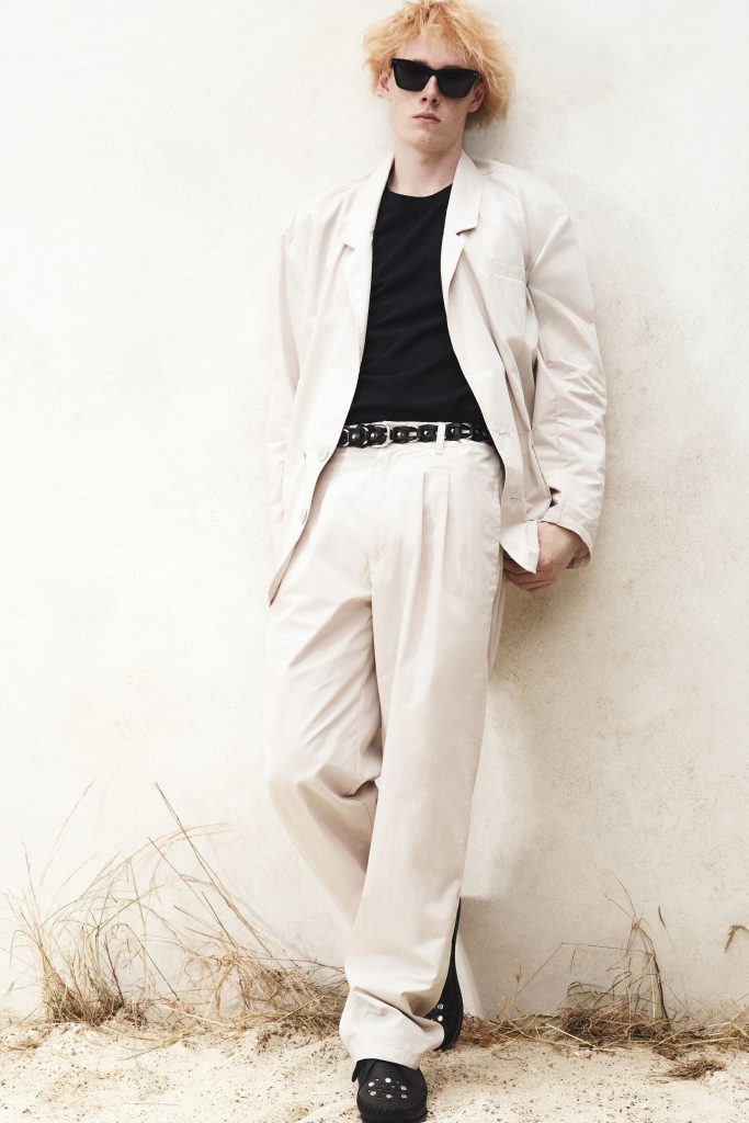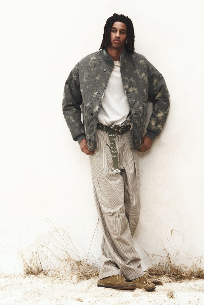 The collection captured sun-bleached European travel memories through khaki, bronze and soft sunset tones. Western embroidery merged with surfer references seen in laser-striped denim and floral graphics. Straighter trousers and fluid tailoring refined the silhouette, while satin bombers and graphic fleece reinforced a relaxed, nostalgic sensibility grounded in effortless seasonal dressing.