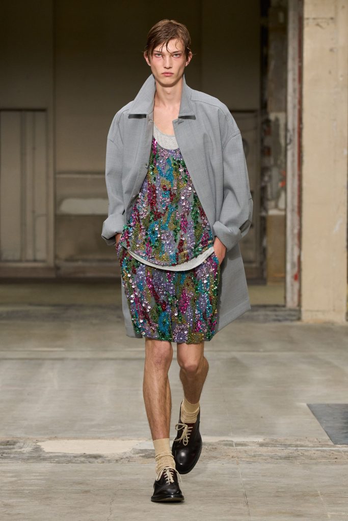 Julian Klausner explored the romantic dishevelment of a formal night out, blending formal archetypes with whimsical fantasy. Opera coats and tuxedo jackets intersected with biker shorts, sequins and thermal knits. Trompe-l’oeil vests and textured cummerbunds enriched visual storytelling. The collection blurred boundaries, offering a poetic wardrobe that embraced expressive layering, playful contradiction and relaxed sophistication.