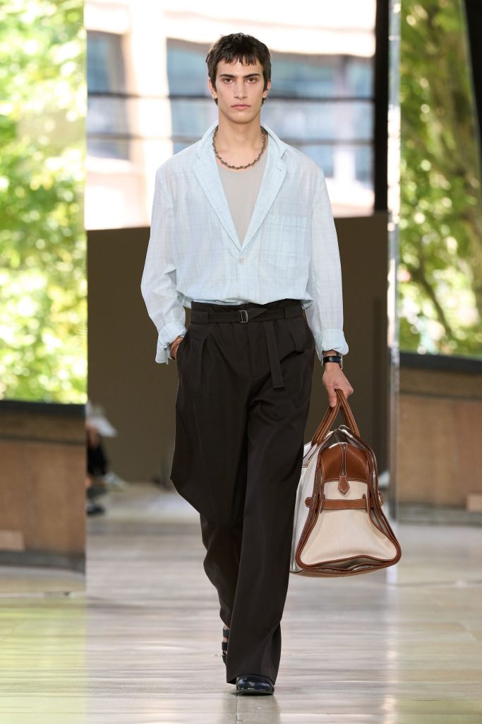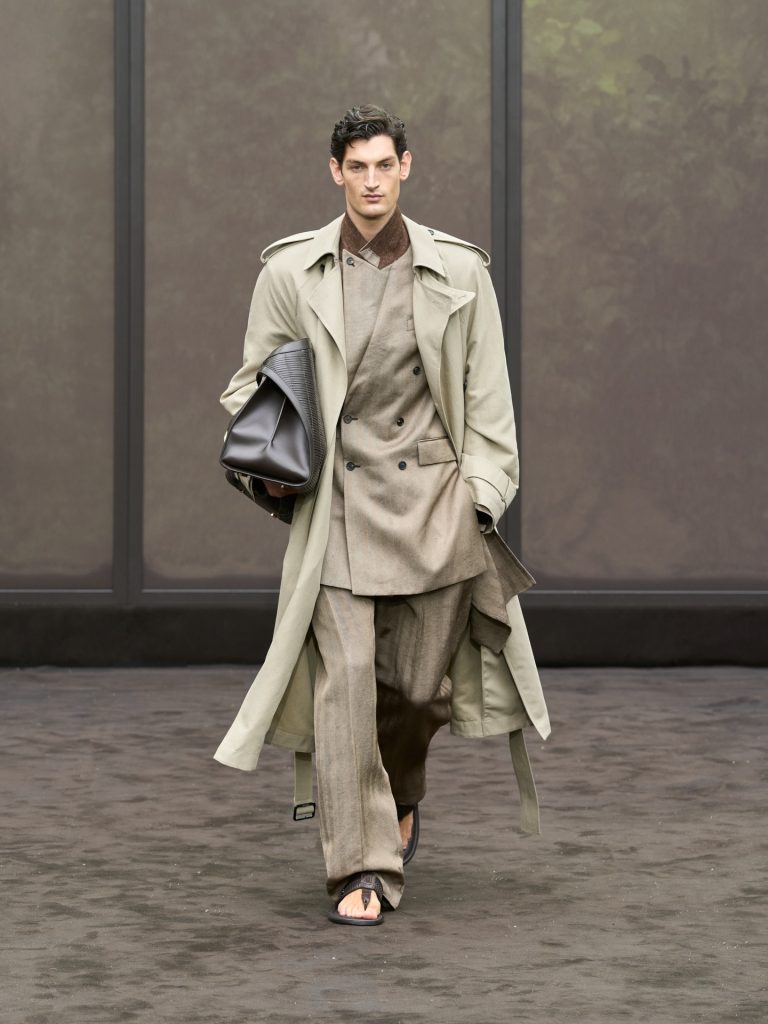 Véronique Nichanian emphasised breathable luxury and discreet sophistication for SS26. Structured macs, wide-leg trousers, perforated leathers and gradient knits formed a refined urban uniform. Earth-toned palettes reinforced calm restraint. Innovation focused on material development rather than narrative theatrics, maintaining Hermès’s timeless clarity and functional elegance for understated modern dressing.