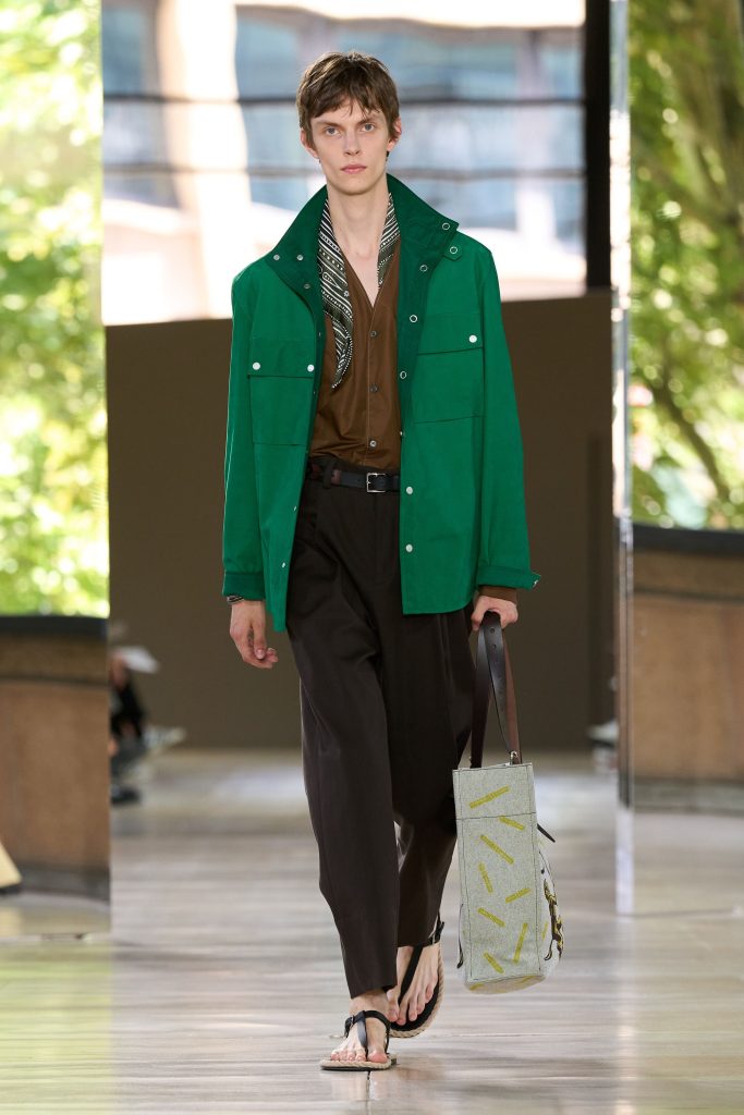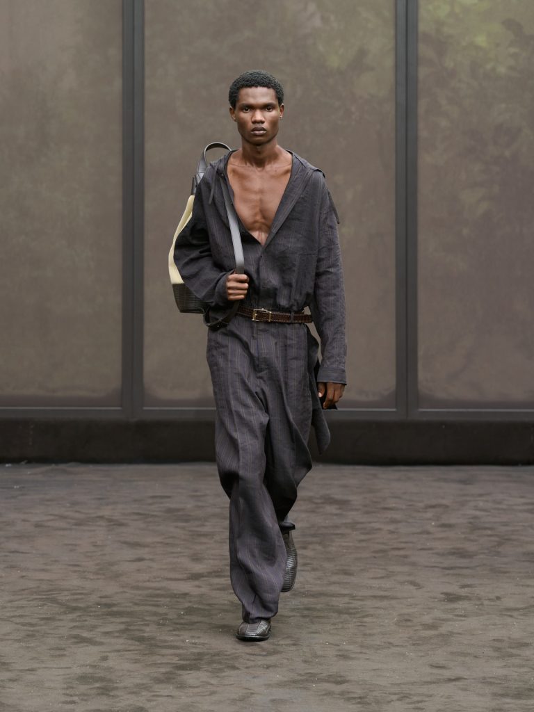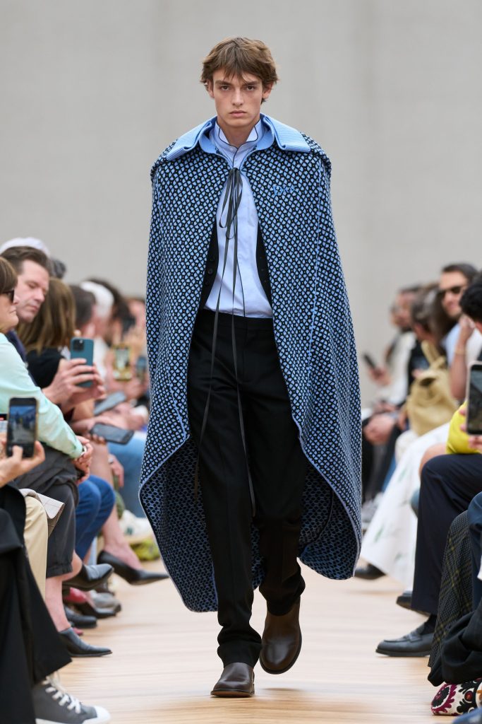 Daniel Lee infused Burberry’s menswear with festival optimism and British summer energy. Slim 1960s-inspired tailoring appeared alongside weather-resistant outerwear enhanced by technical coatings. Trench coats were laser-cut with paisley patterns and finished with fringing and macramé detailing. The collection balanced heritage tailoring with youthful experimentation, projecting a renewed sense of glamour, playfulness and craftsmanship-driven modernity.