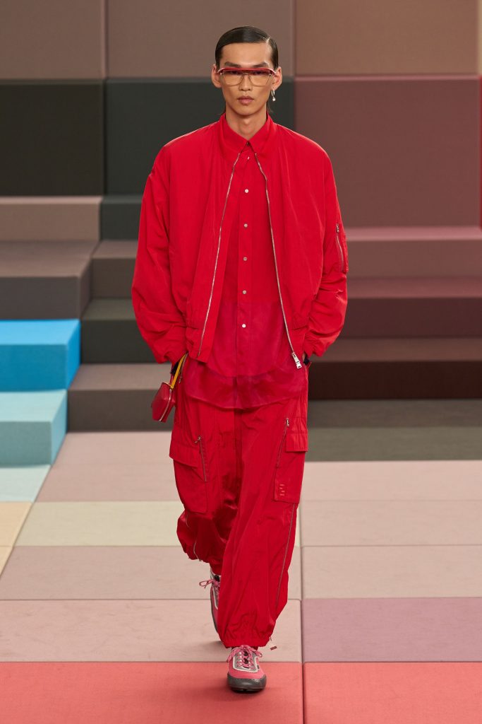 Fendi envisioned a relaxed summer through fluid silhouettes and vibrant colour. Modular tailoring, organzacollared bombers and sheer jacquard sets created lightness and visual play. Bright buttonhole detailing enhanced tailoring precision. The palette of bubblegum pink, turquoise and yellow reinforced optimism while maintaining artisanal refinement, balancing expressive colour with technical craftsmanship and wearable romance.