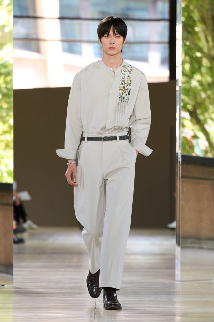 Jonathan Anderson’s debut explored a dialogue between archival codes and contemporary ease. Masculine interpretations of the Bar Jacket, relaxed capes, embroidered shorts, draped trousers and casually knotted ties conveyed a lived-in aristocracy. Historical references were softened through fluid styling and intellectual restraint, creating a wardrobe that felt refined yet approachable for a new generation seeking subtle luxury and expressive individuality.
