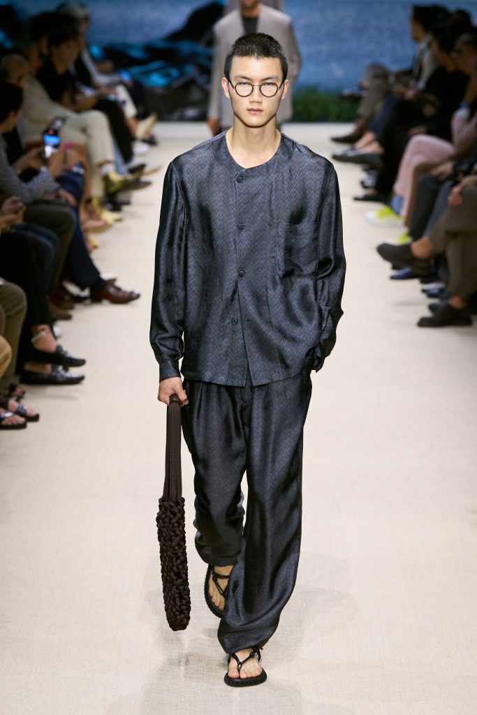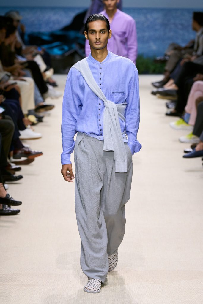 City living and holiday ease converged through relaxed tailoring and airy construction. Abbreviated double-breasted jackets with shawl collars paired with wide teardrop-pleated trousers tapered at the ankle. The silhouette emphasised lightness, balance and fluid sophistication, reinforcing Armani’s signature harmony between structure and softness while maintaining effortless elegance suitable for modern transitional lifestyles.