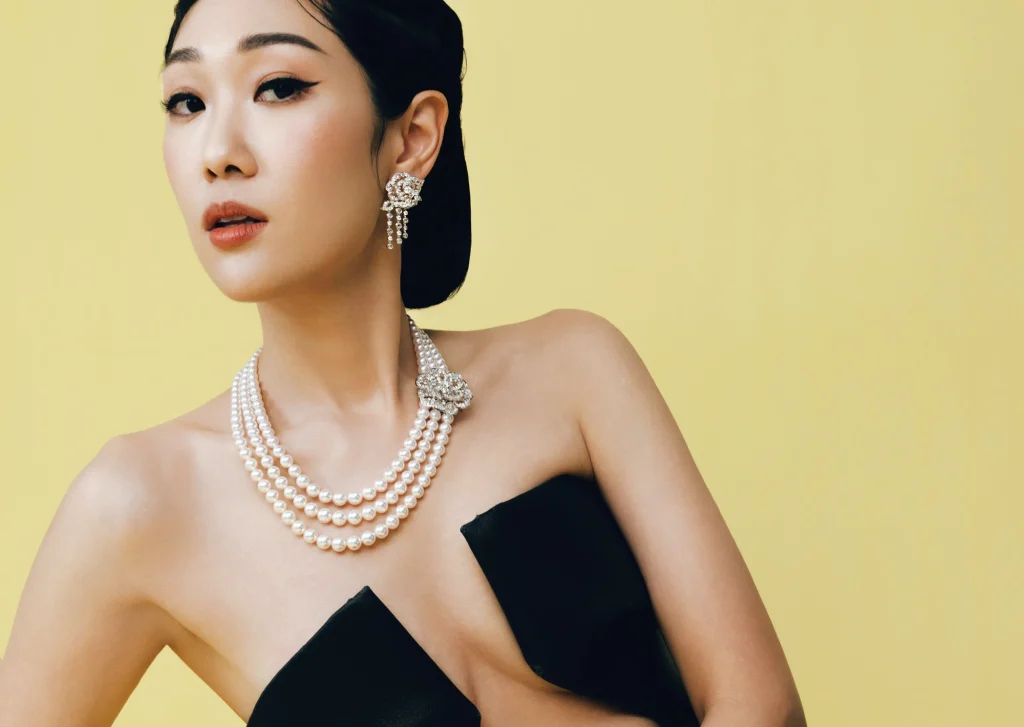 The Bows necklace in 18K white gold with Akoya cultured pearls and diamonds, and earrings in 18K white gold with white South Sea cultured pearls and diamonds, and High Jewellery Collection bracelet in 18K white gold with Akoya cultured pearls and diamonds _ Mikimoto
