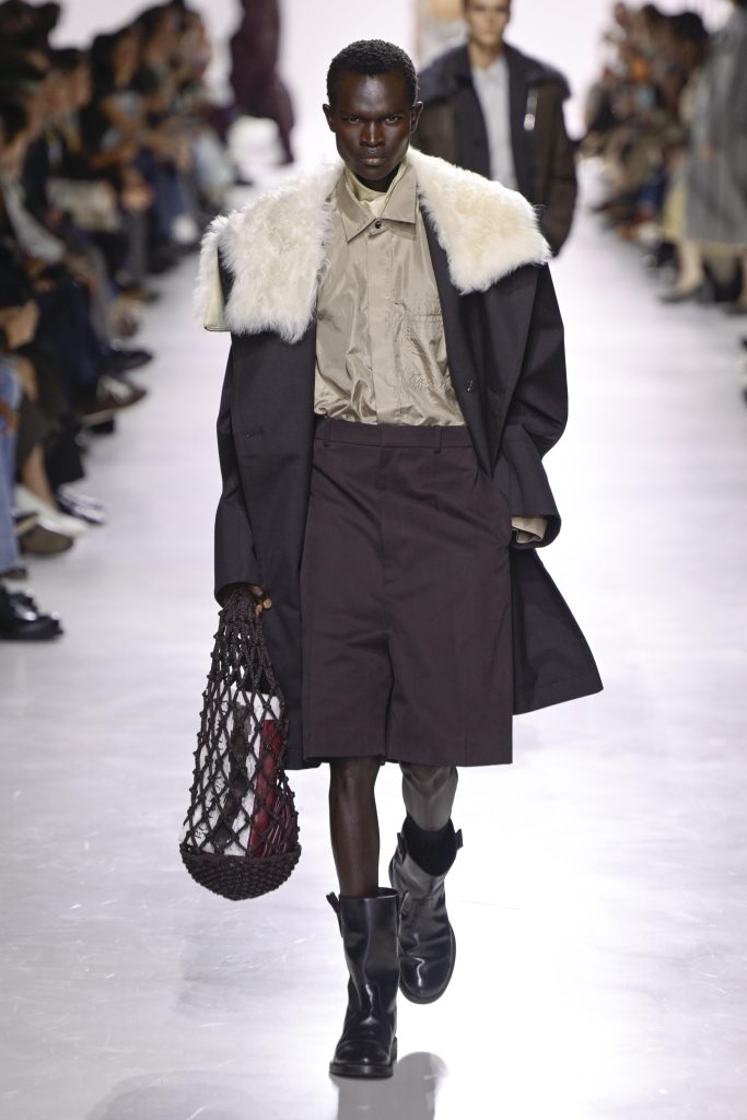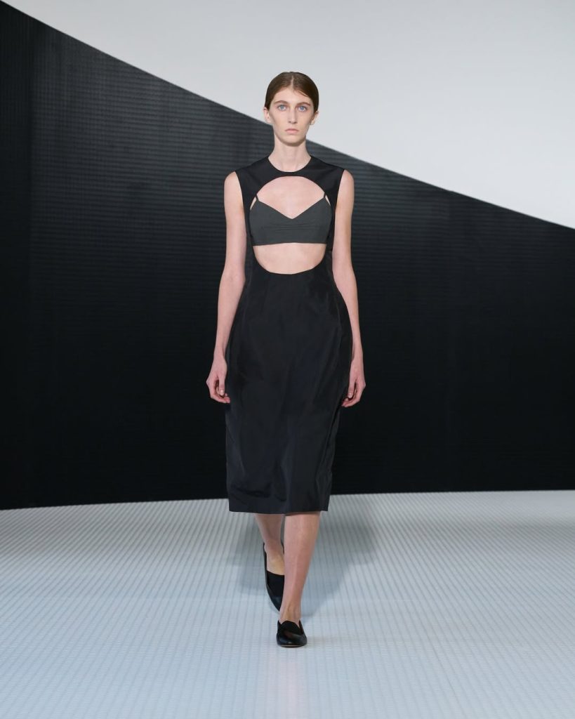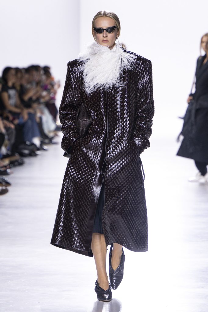 Louise Trotter’s debut for Bottega Veneta continued the brand’s dialogue with craft, centreing on the house’s iconic Intrecciato weave. Trench coats and fur gowns played with the balance of strict menswear tailoring and fluid lines. A highlight was a cropped jacket crafted from recycled strips of colored fiberglass, fluttering with each movement in a display of both softness and elegance. All pieces reaffirm the brand’s dedication to artisanal excellence while framing “softness” and “functionality” as complementary forces.