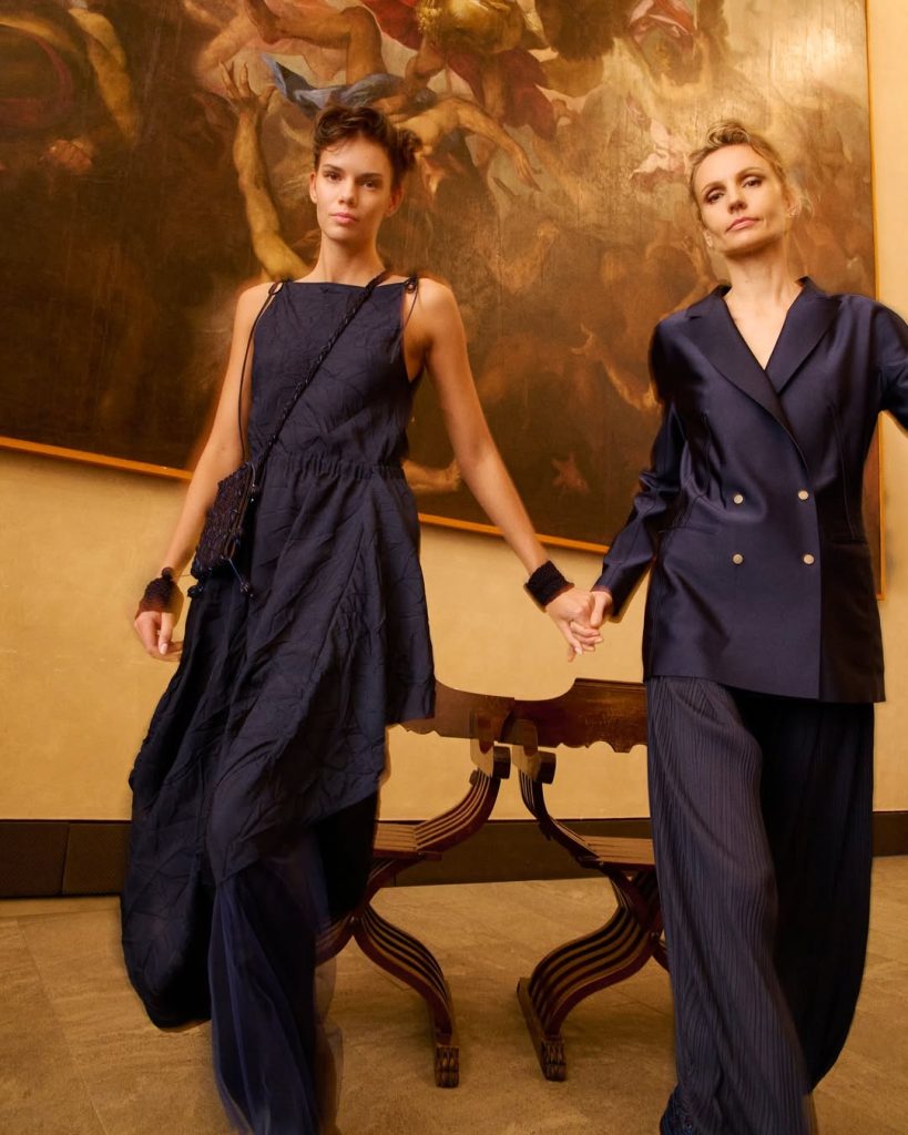 For Giorgio Armani, this season marked a farewell. Following the designer’s passing in September, the house returned to Milan’s Pinacoteca di Brera – where Armani grew up – to present his final collection. Inspired by Milan and the island of Pantelleria, flowing fabrics and fluid lines conveyed images of earth, sea, and light. The palette transitioned from neutrals to midnight blues, with soft tailoring, shimmering evening wear, and ethereal gowns embodying Armani’s timeless aesthetic. Simultaneously, Emporio Armani presented a Spring/Summer 2026 line that fused clean tailoring with chiffon and airy skirts, a dialogue between masculine and feminine.