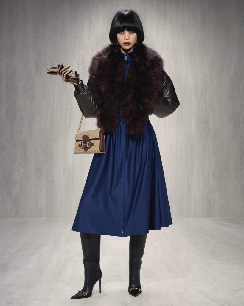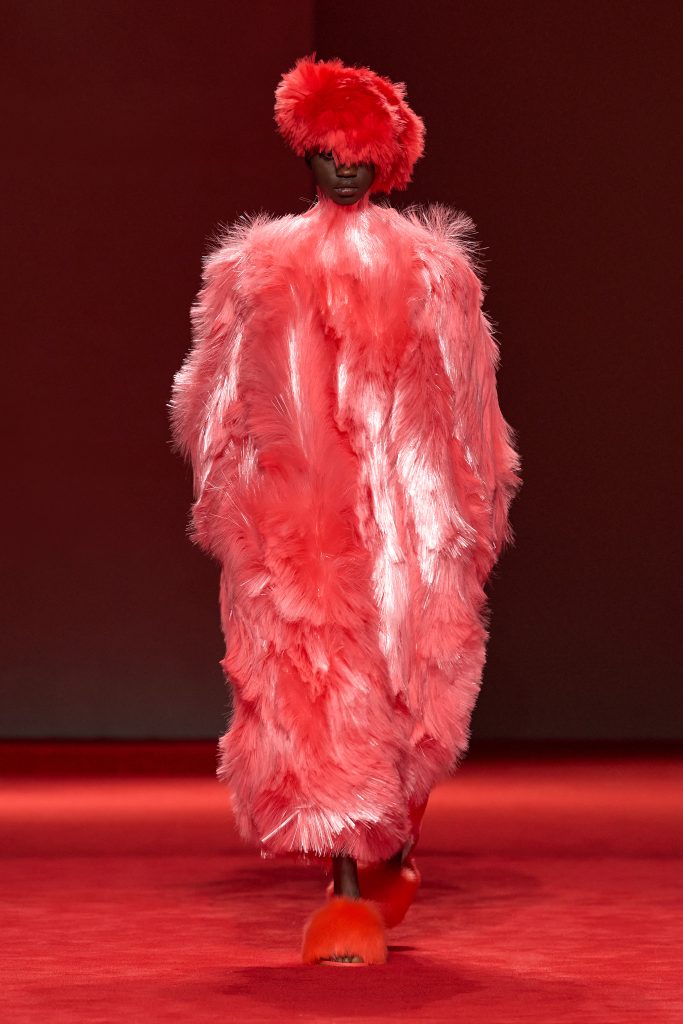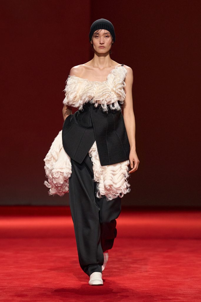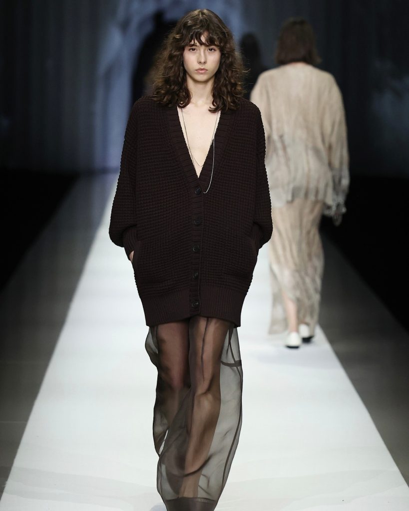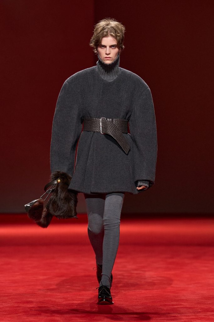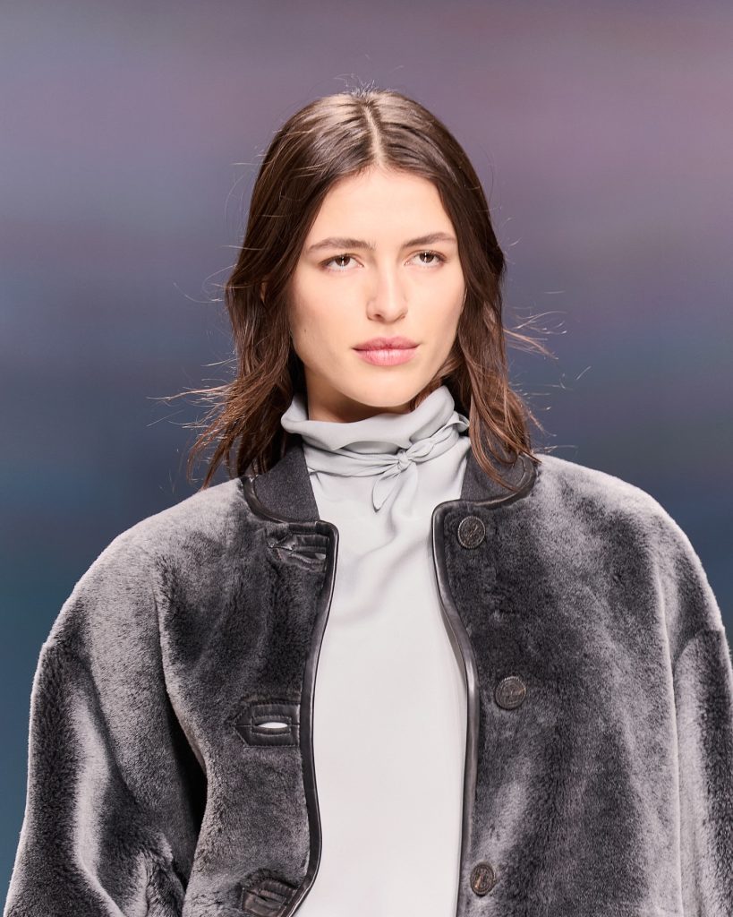 Finally, there’s the idea of softness and fluff – winter’s sense of security translated into plush, tactile surfaces that invite touch and cocoon the body. Bottega Veneta reimagined a full faux-fur dress crafted from technical fibres: surprisingly lightweight despite its generous volume. Gucci and Tod’s incorporated fur trims into coats and collars. Giorgio Armani paired a grey plush jacket with a grey silk skirt, balancing strength and fluidity in one look.