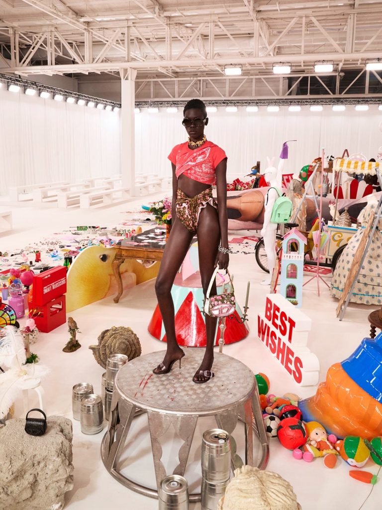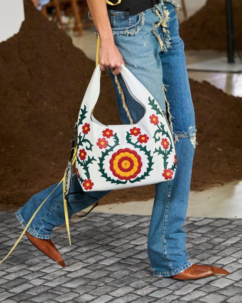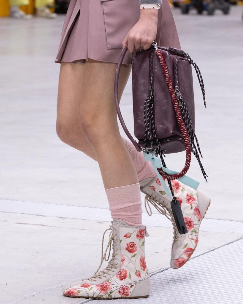 The first thing that stood out was how florals dominated, appearing almost everywhere – not as mere decoration but as central motifs driving the narrative. At Onitsuka Tiger, delicate blooms softened crisp white floral denim paired with boxing boots, injecting freshness while preserving the brand’s sporty edge. Diesel took florals into gritty street territory, scattering blooms across brown high-waisted micro shorts and bags. Fendi, under Maria Grazia Chiuri’s debut, handled florals with intimacy, appearing on sheer lace dresses where the motifs felt subtle and sensual.