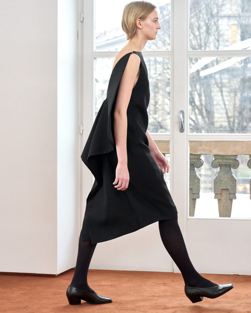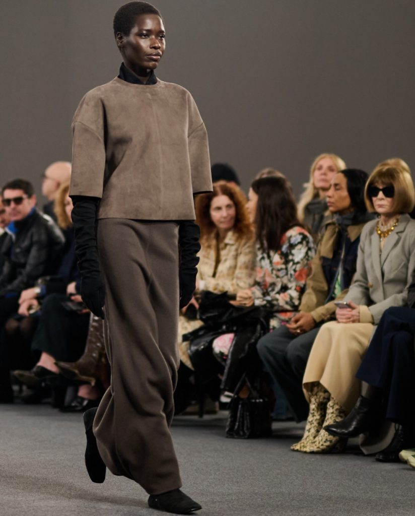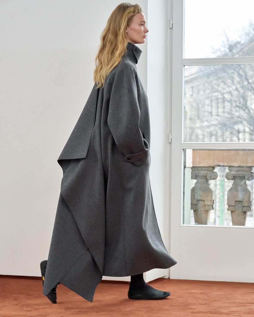 Of course, fluidity isn’t the whole story. Structure still defines autumn dressing – just in a more relaxed, contemporary way. At Bottega Veneta, sharply widened shoulders dominated tailored jackets, serving as the visual anchor. Jil Sander refined classic black dresses and grey coats through precise collars, clean lines. Prada and Ferragamo both emphasised shoulders and neckline proportions in outerwear. What’s interesting is that these broader shoulders aren’t paired with ultra-tight tailoring. There’s deliberate space and ease – room to move, to layer to breathe.
