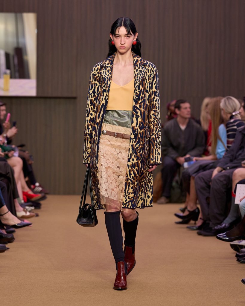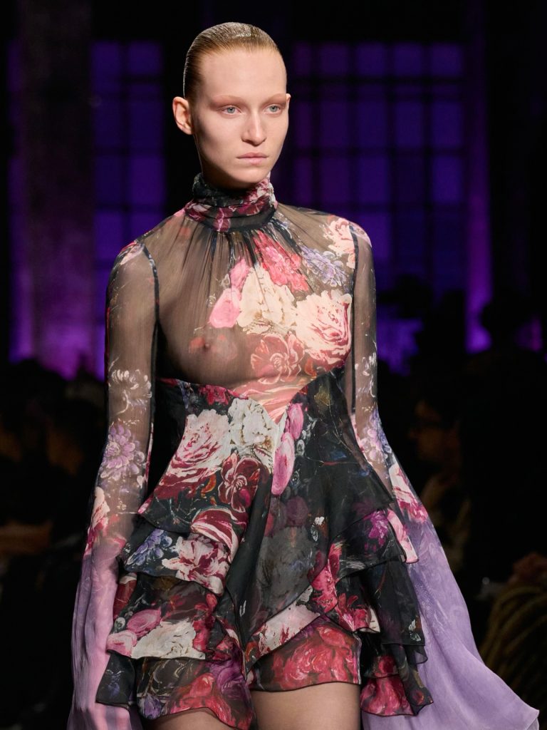 Autumn/Winter usually leans into weight and structure, but this season designers deliberately counterbalanced that heaviness with silk and transparency. Anteprima offered fluid black silk gowns and a soft green floral high-neck blouse that moved with effortless grace. Ferragamo’s gold silk silhouettes shimmered liquid-like with every step. Roberto Cavalli layered delicate lace over printed silk, and Marni styled sheer silk skirts directly over underpinnings, embracing unapologetic visibility: nothing concealed, everything intentional and confident. These lighter fabrics act as a deliberate counterpoint – softening the impact of structured coat. They keep the looks wearable rather than theatrical, and unexpectedly adaptable to real life.