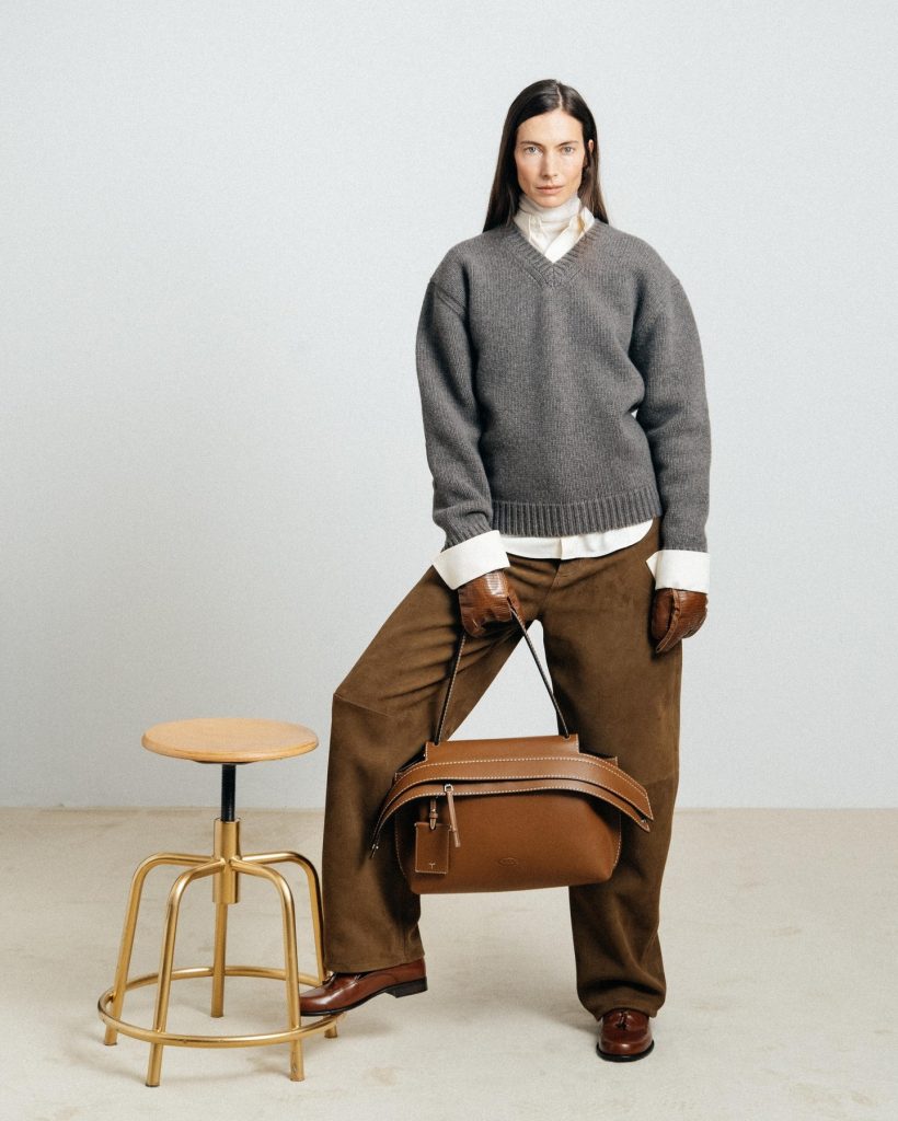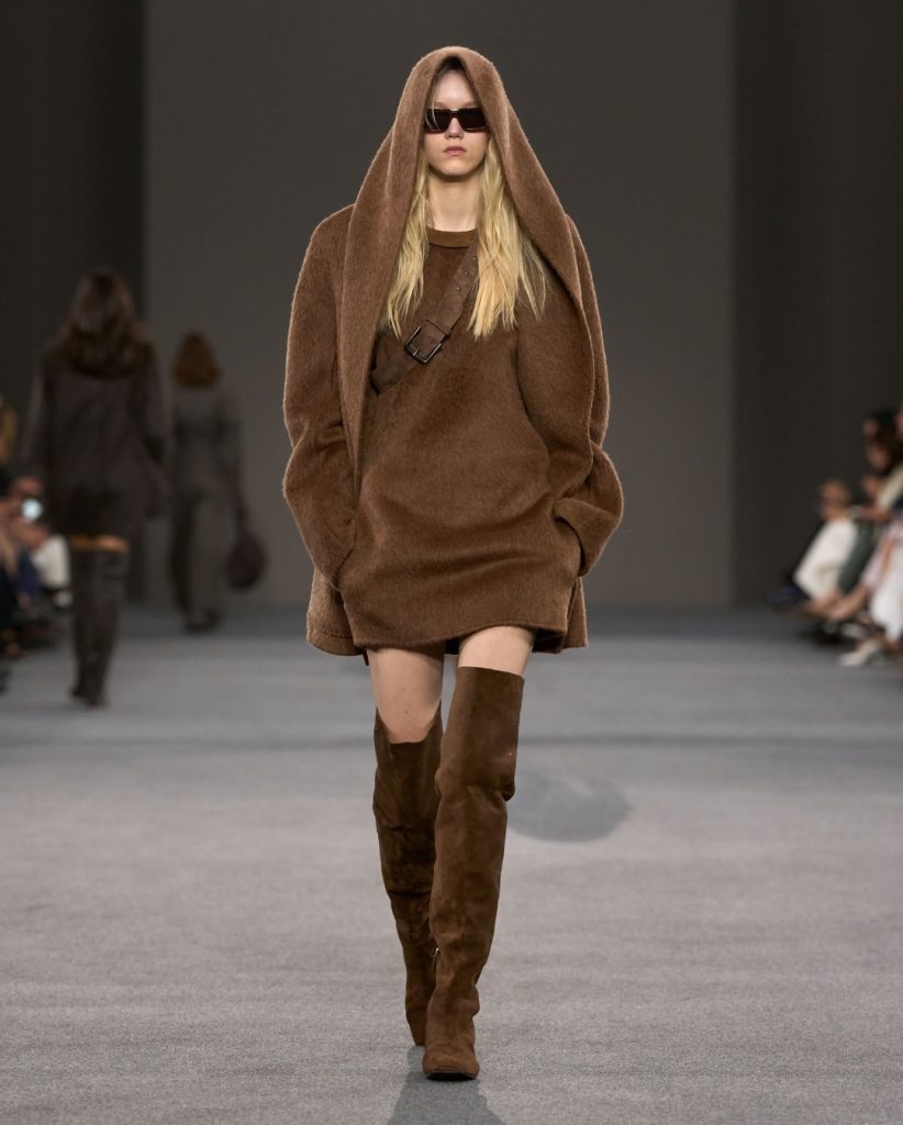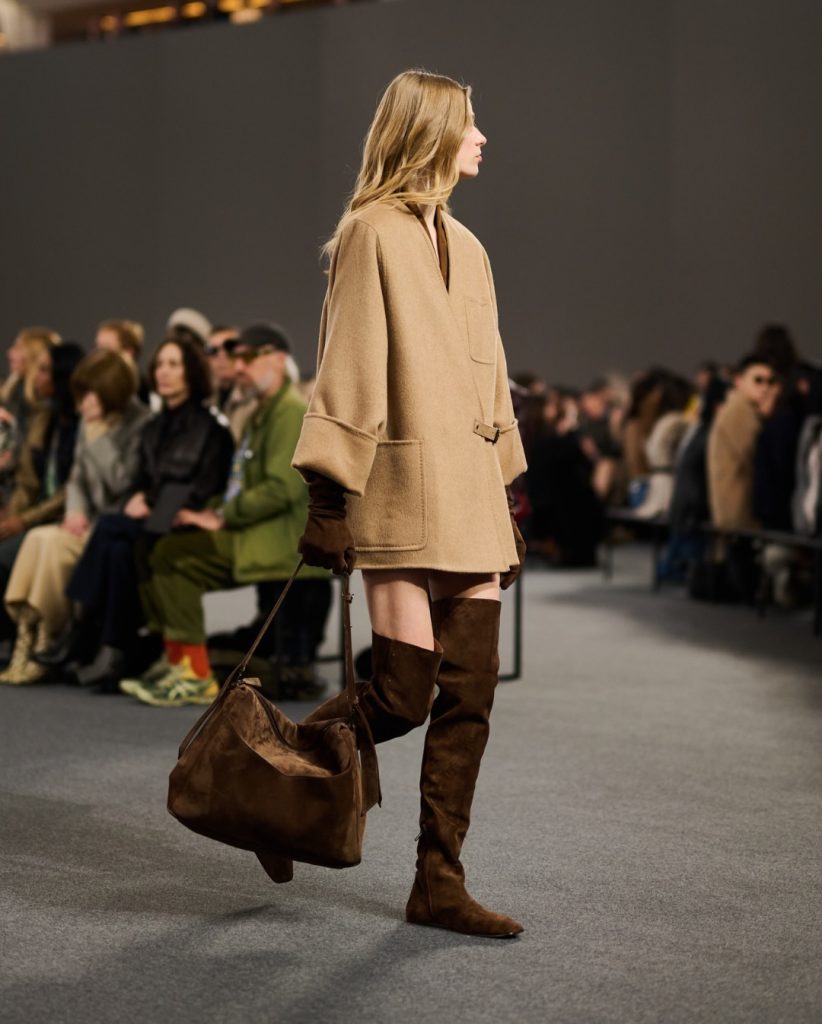 Colour palettes this season leaned towards low saturation in beige, latte brown, soft grey, burgundy, deep navy and muted earths – forming a restrained, grounding base across Milan. Tod’s and Sportmax centred their collections around earthy tones. Giorgio Armani layered navy, wine, purple,and grey with masterful subtlety to create a mature, composed elegance. Max Mara stayed true to its signature neutrals, letting beige and soft grey anchor the mood.