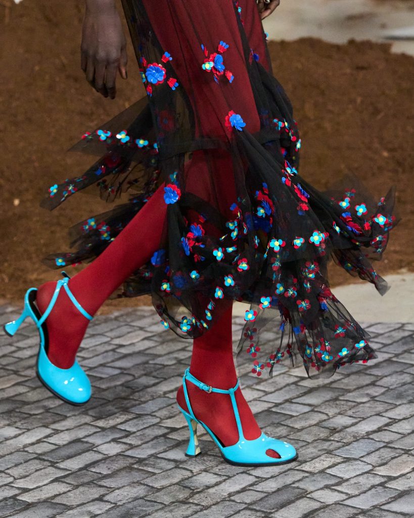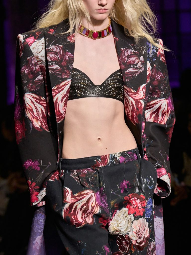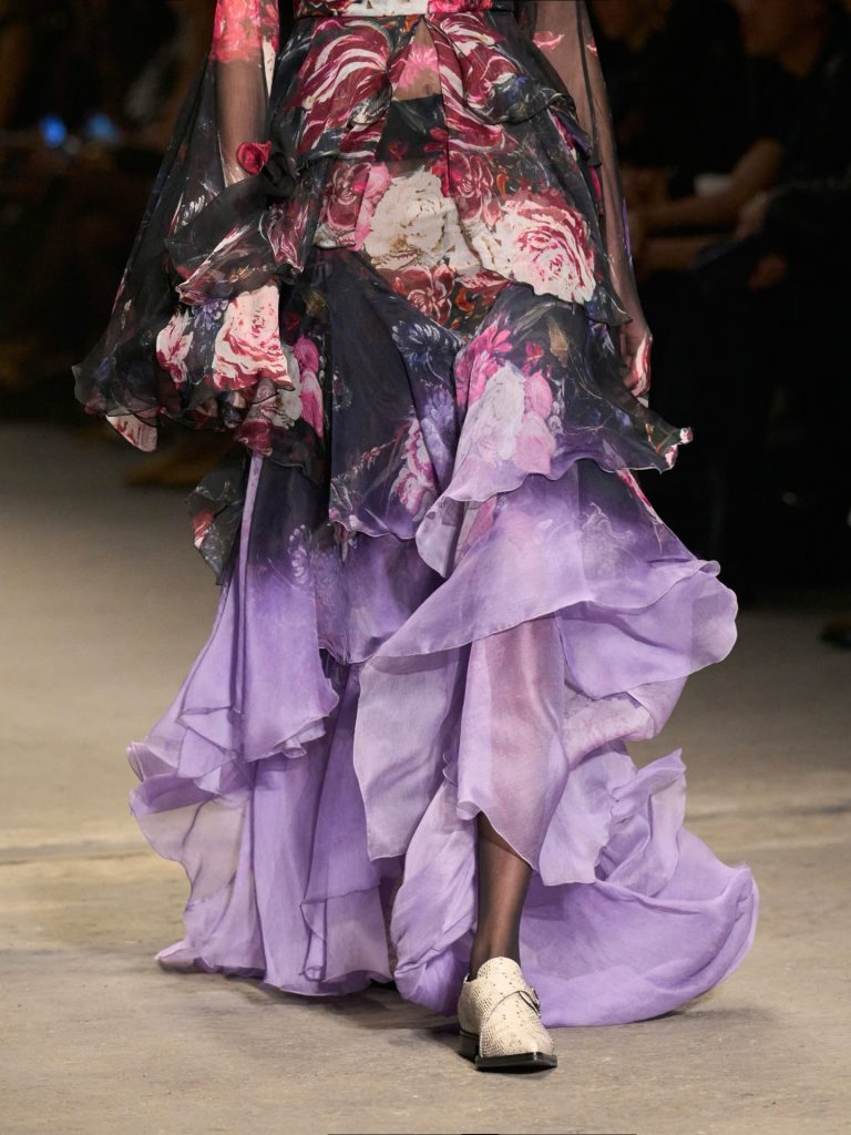 Elsewhere, Prada placed blooms on socks and mid-length skirts with surprising clarity, while Marni’s silk floral skirts carried a gentle vintage mood. Roberto Cavalli stayed loyal to its sensual DNA, rendering florals in bold printed mini dresses; and Moschino translated the theme playfully, scattering florals across shirts, brooches and playful prints. The message across Milan felt consistent: next season, at least one floral piece belongs in your wardrobe –whether subtle or statement.