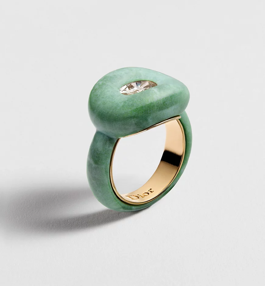 For a touch of high-fashion whimsy, the Dior Rocks ring is a standout accessory. Inspired by the energy of Jonathan Anderson’s debut for the house, this ring combines gold-finish metal with a stone-effect resin that mimics the organic look of natural minerals.