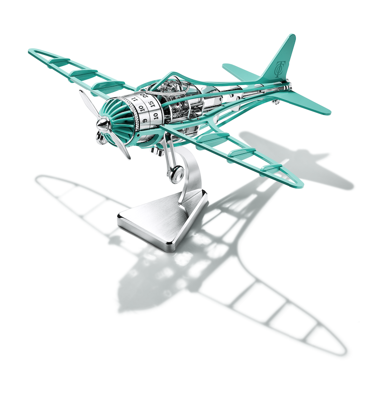 Adding to its Time Objects collection of table clocks that fuse form and function with whimsical ingenuity– which includes the Tiffany Taxi clock inspired by a 1950s New York City taxicab – Tiffany & Co. has unveiled a high-end evolution of its previous aviation-inspired clock. The Tiffany Airways Diamond Edition incorporates 511 round brilliant diamonds totaling 4.5 total carats and a manually wound mechanical movement that offers an eight-day power reserve. Hours and minutes are displayed on stainless steel disks at the plane’s nose, with the cockpit’s cage culminating in an arrow-shaped display that points to the current time.
