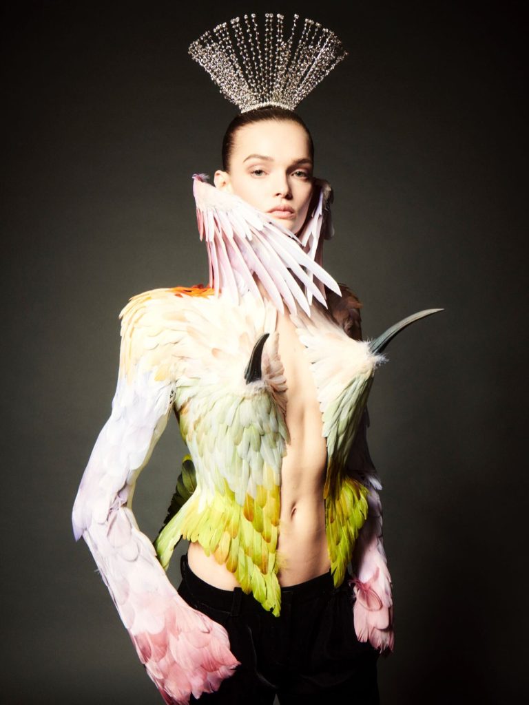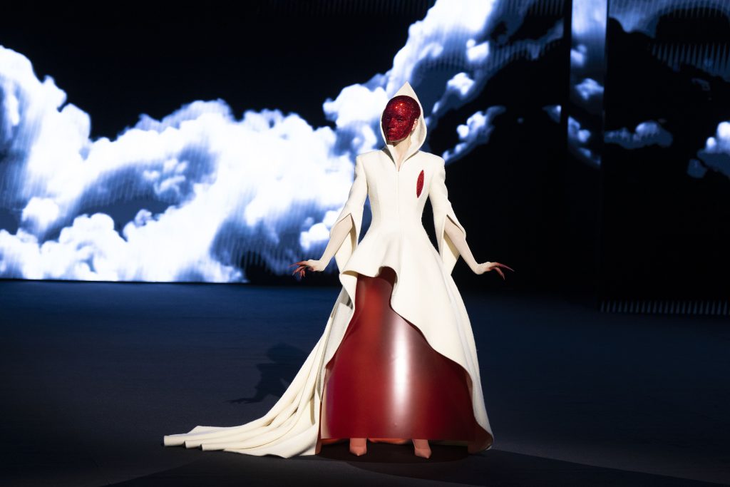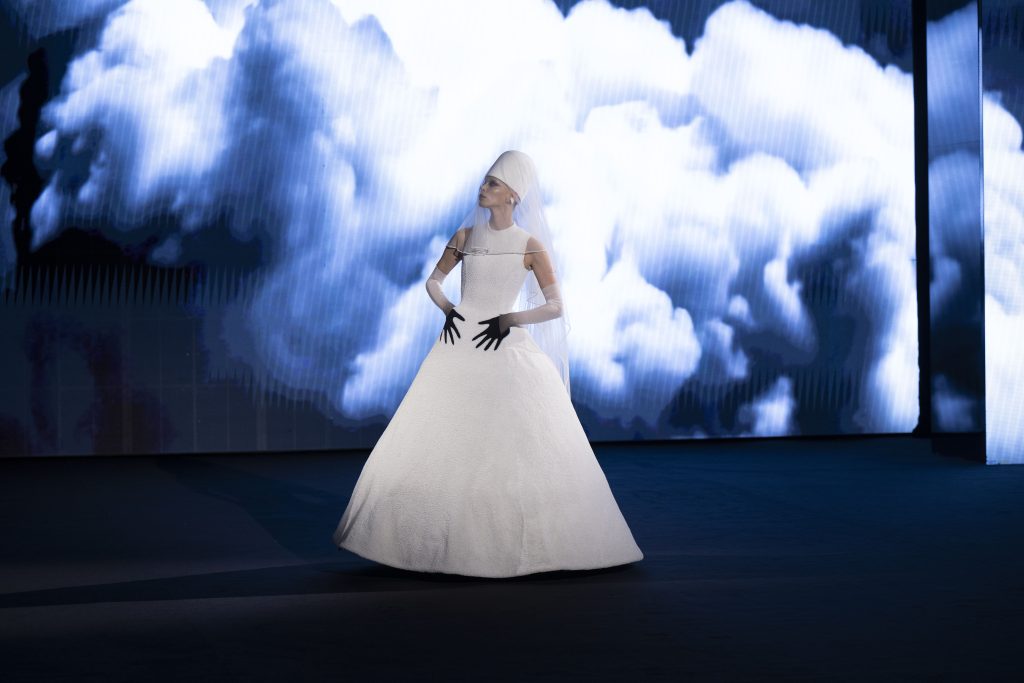 Titled “Diamond Kite”, the collection centred on the metaphor of flight, escape, ascension and spiritual liberation. Translucent hues, floating structures and weightless silhouettes created an illusion of suspension. Airy tulles and surreal forms merged into a gravity-defying aesthetic, pushing couture into poetic and philosophical territory.