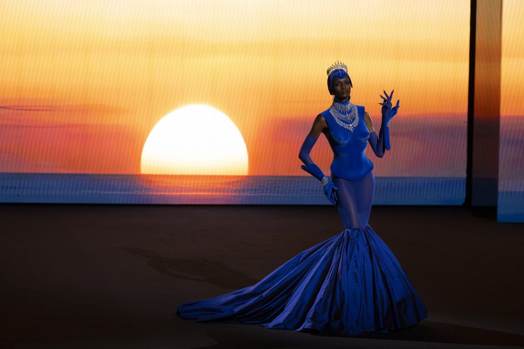 Rahul Mishra’s “Alchemy” drew inspiration from the five elements: earth, water, fire, air and ether, using nebula embroidery, metallic threads and three-dimensional beadwork to depict cosmic motion. Each garment was created as a wearable astronomical tapestry, a meditative luxury elevated through extreme craftsmanship.