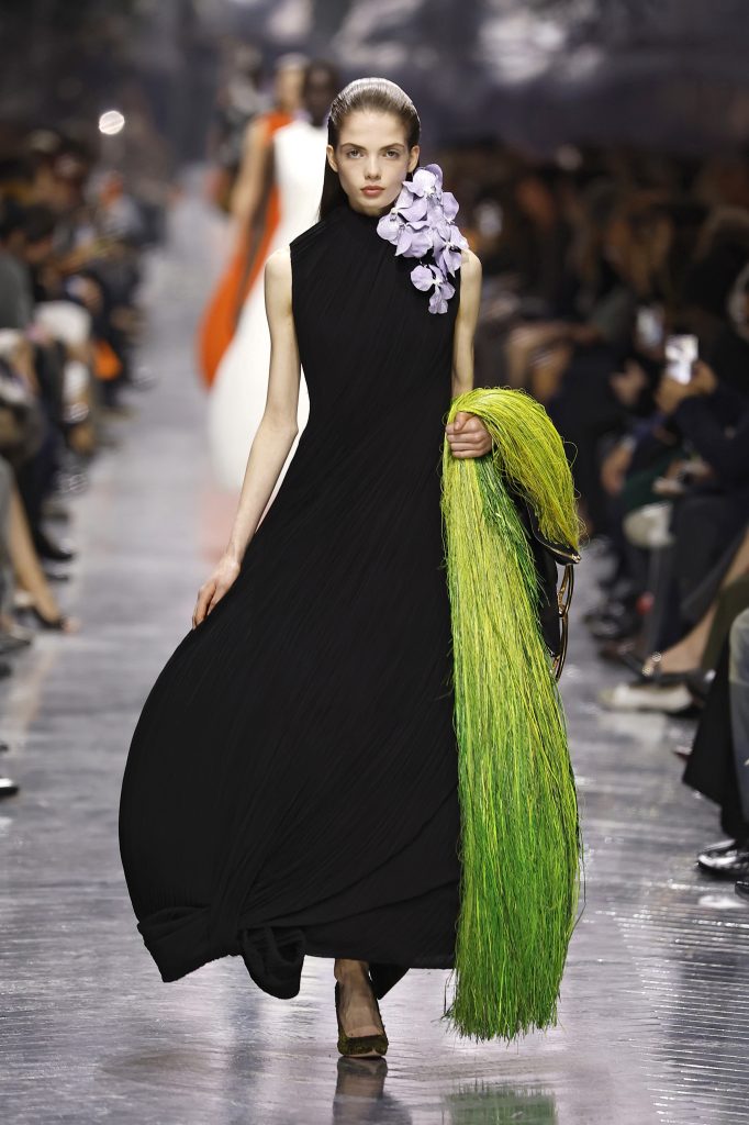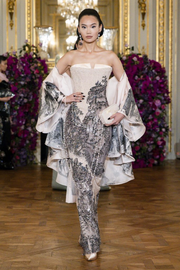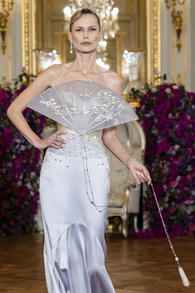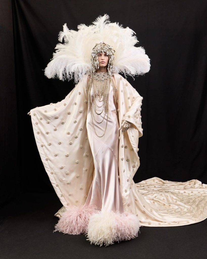 Soft misty pinks, petal whites, pale lilacs and smoky greys set a serene palette. While dyed silks, sculptural embroidery, embossed fabrics and layered chiffon created feather-light textures. Fluid gown silhouettes, petal-structured headpieces and sculptural handbags injected vitality into each look. The collection also paid homage to John Galliano, transforming the show into a dialogue between heritage, respect and innovation.