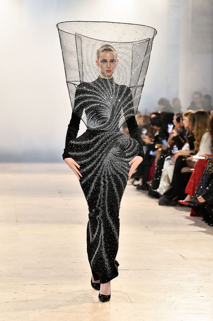 Gaurav Gupta’s couture collection, “Divine Androgyne”, explored Indian mythology and cosmic philosophy, addressing yin-yang balance, gender fluidity and spiritual awakening. Conjoined twin silhouettes, metallic structures, fluid drapery and halo-like forms created surreal sculptural bodies. Cosmic silver, astral white and obsidian black formed a futuristic palette, transforming the show into a philosophical meditation on form, spirit, and transcendence.