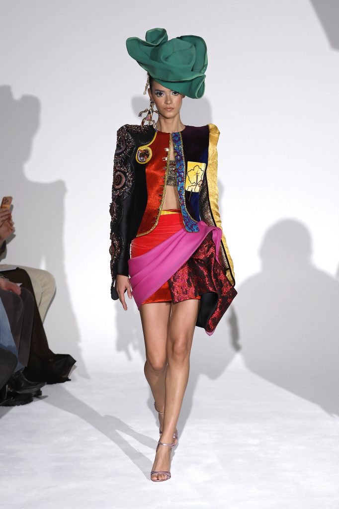 A pioneer of sustainable couture, Ronald van der Kemp utilised recycled textiles and antique lace to construct deconstructed silhouettes. High-saturation colour clashes and asymmetrical structures challenged traditional purity, translating environmental philosophy into tangible design and offering couture a progressive new perspective.