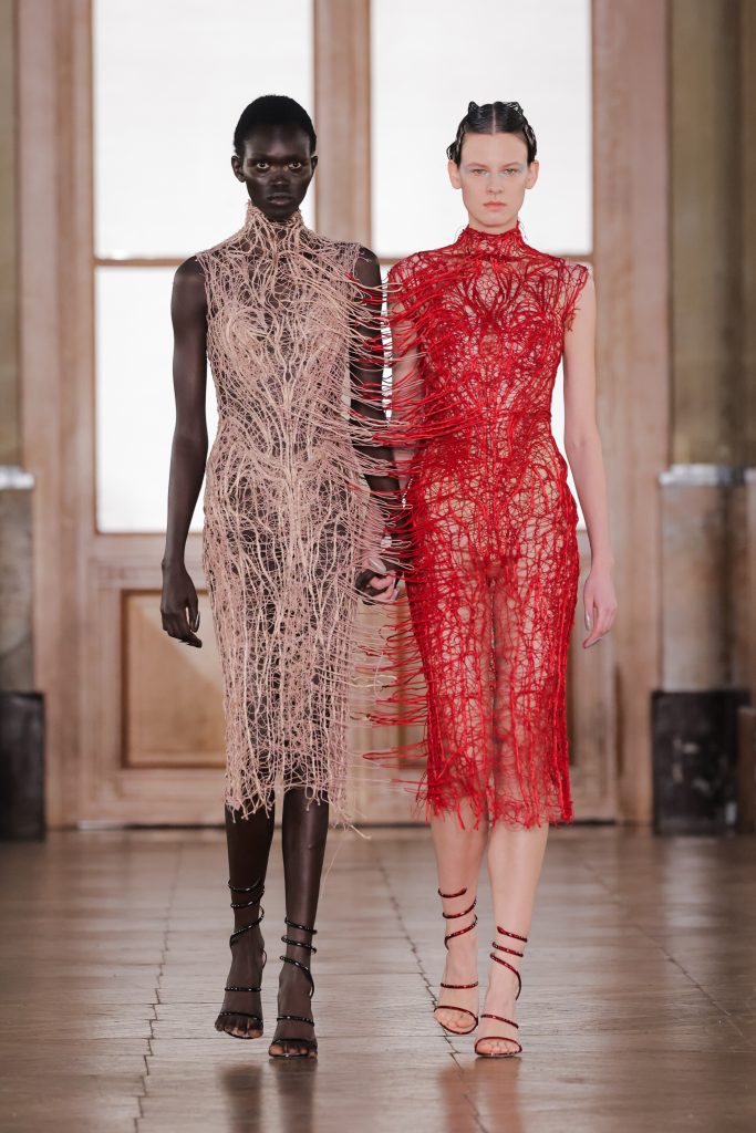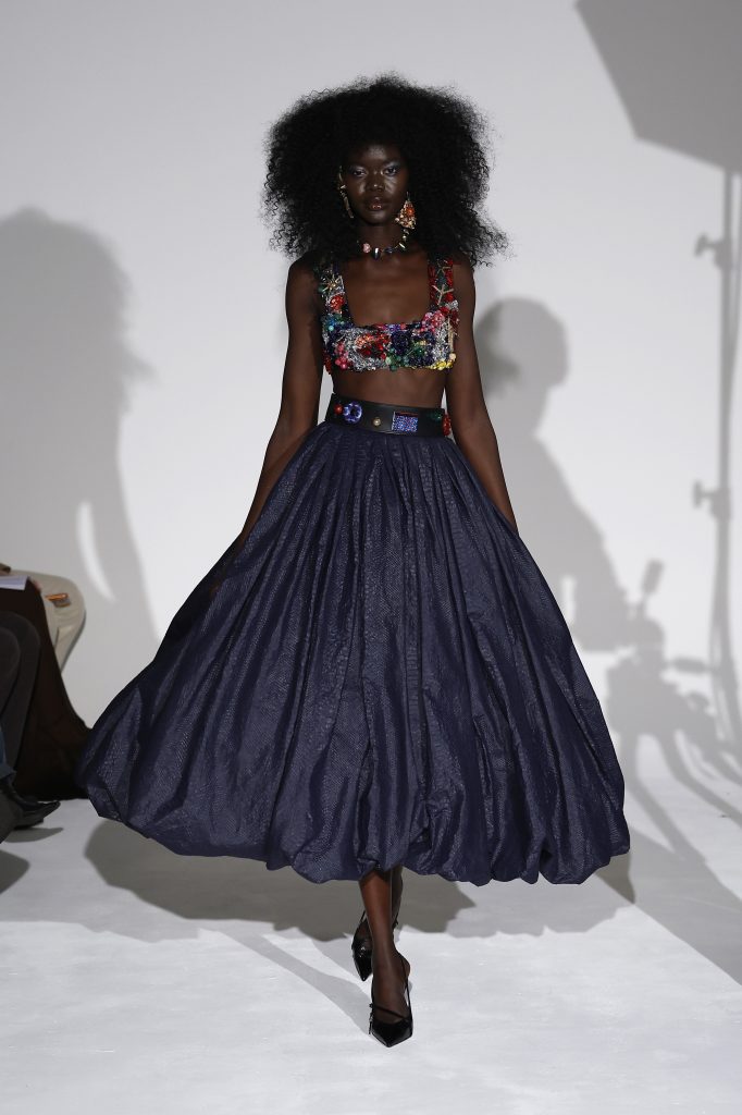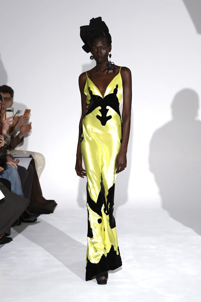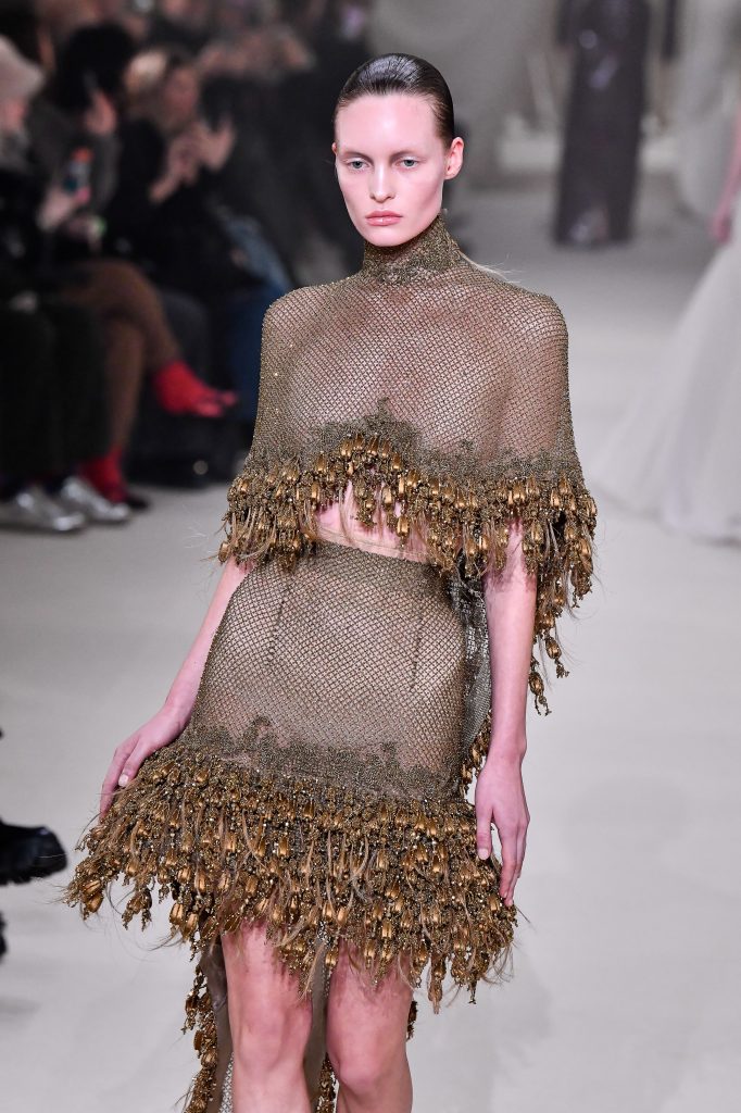 Daniel Roseberry continued the maison’s signature theatrical and fancy design core, creating a mythical aviary kingdom inspired by religious iconography, mythology and human anatomy. Drawing from the frescoes of the Sistine Chapel, scorpion tails, serpent fangs and bird beaks were translated into dramatic silhouettes and accessories. Black, gold and silver built sacred tension, enhanced by metallic sculpture, resin crystals and dimensional embroidery. All in all, the collection delivered a powerful visual drama.